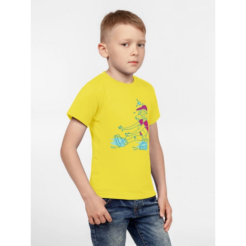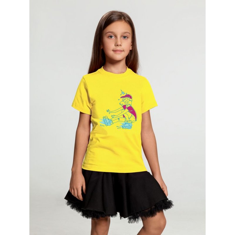 Кроеная детская футболка с круглым воротом-резинкой (рибана 1х1 с лайкрой). Высокое качество материалов: полотно джерси (кулирная гладь), прошедшее предварительную термоусадку; нить 30/1; особо гладкая гребенная пряжа. Активное крашение полотна.