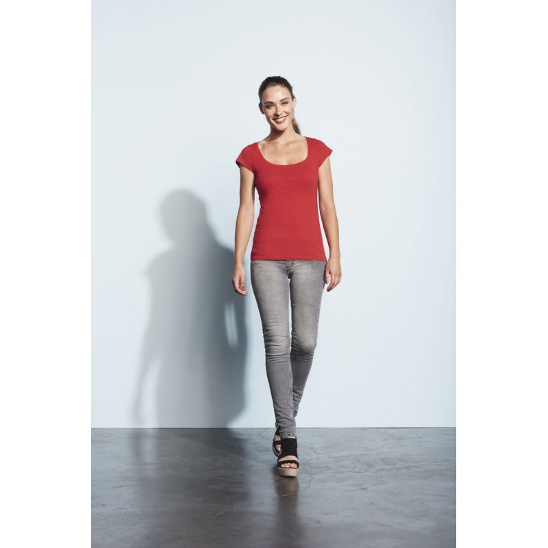 Футболка женственного приталенного силуэта с американской проймой и глубоким вырезом, отделанным обтачкой из джерси. Двойная прострочка на вороте спереди, на рукавах и по низу.
