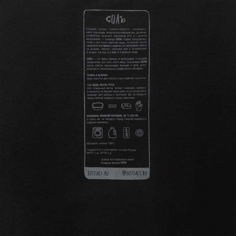На изнаночной стороне футболки напечатан принт с информацией о бренде и инструкцией по уходу за изделием.