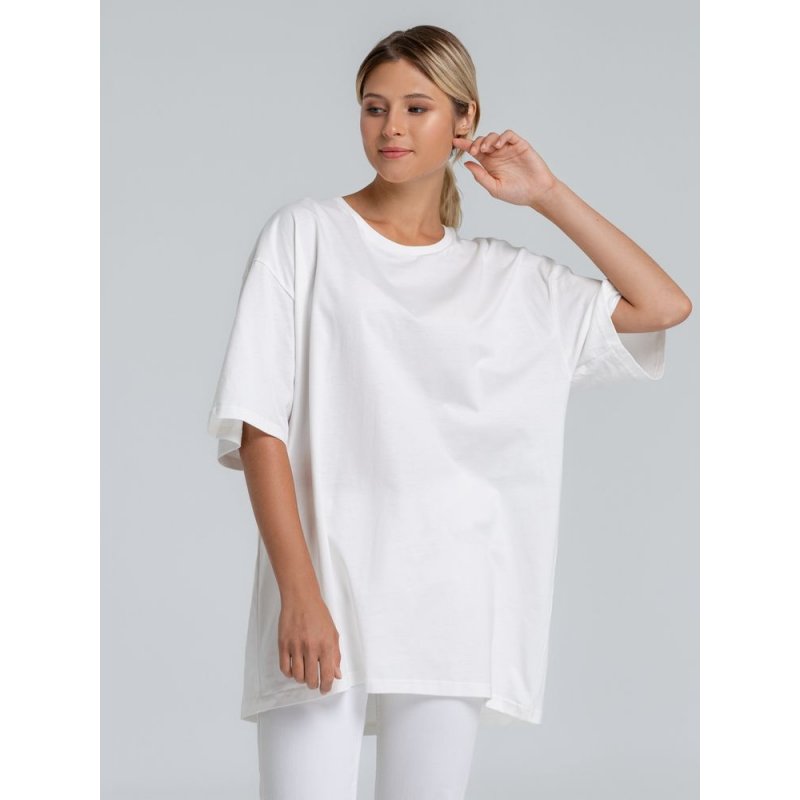 Футболка унисекс со спущенным плечом и круглым вырезом, отделанным резинкой.