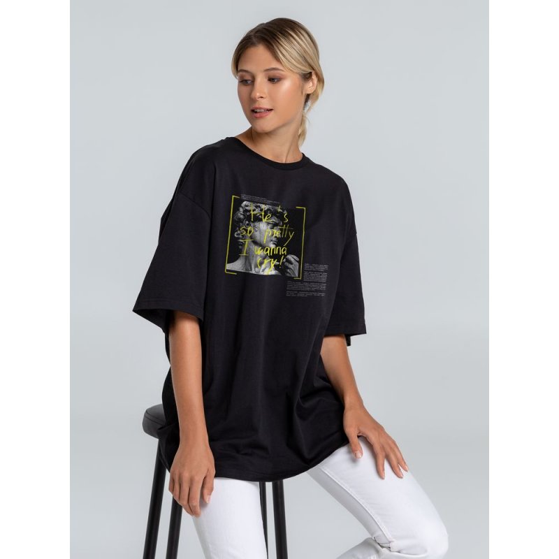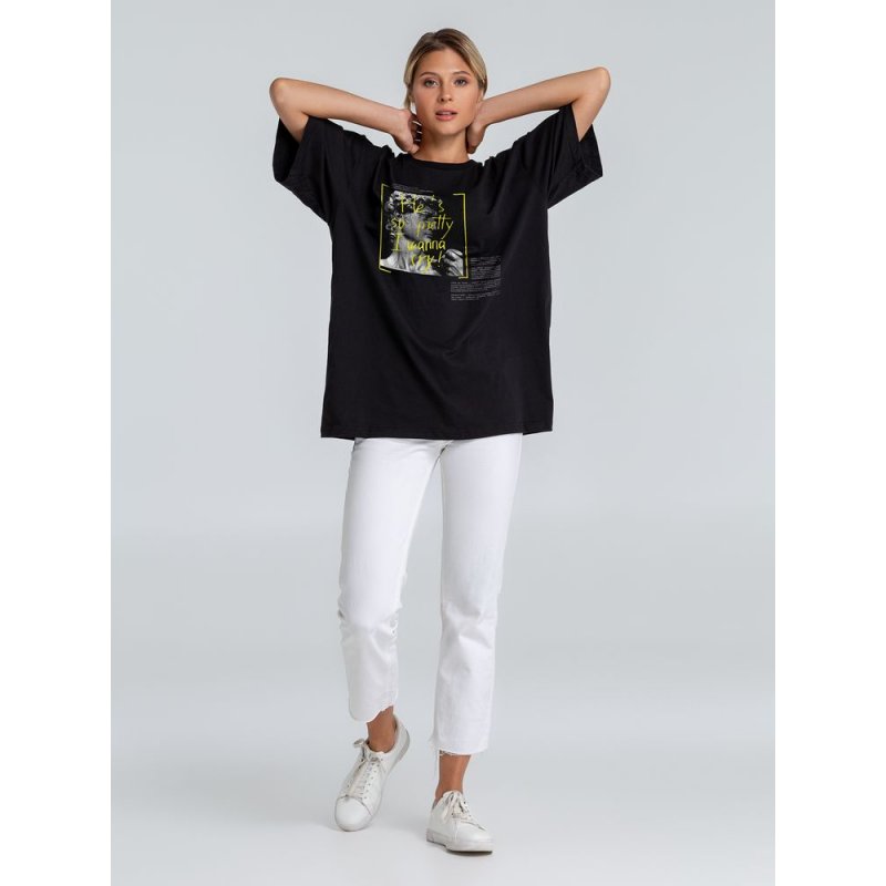 Футболка унисекс со спущенным плечом и круглым вырезом, отделанным резинкой.