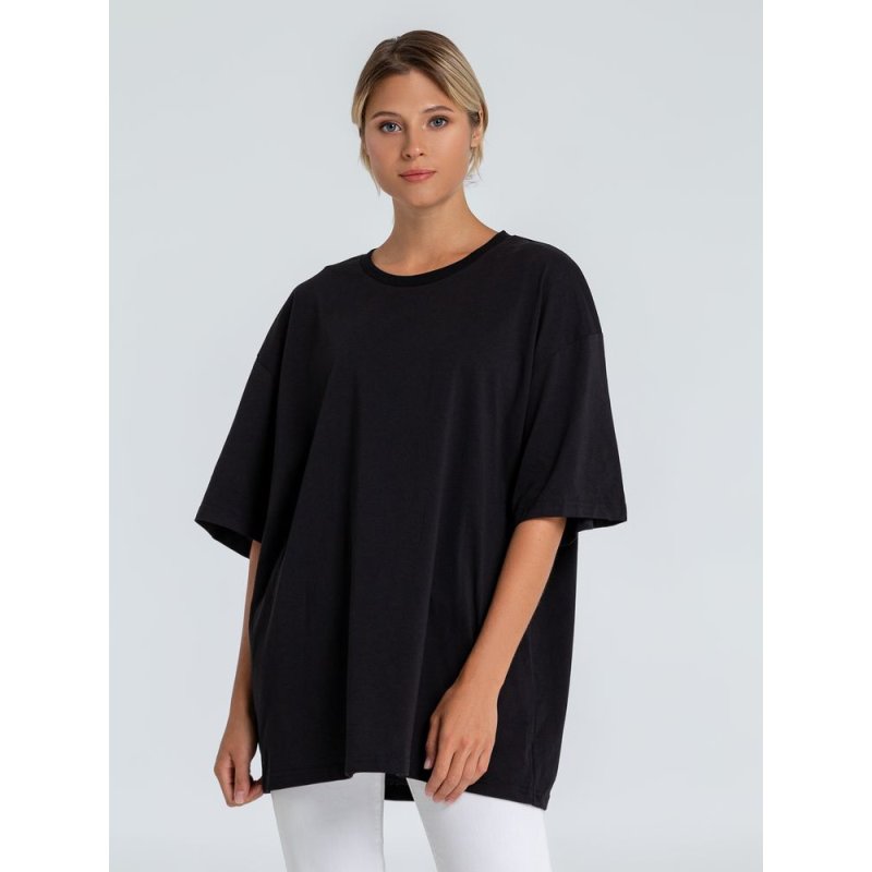 Футболка унисекс со спущенным плечом и круглым вырезом, отделанным резинкой.