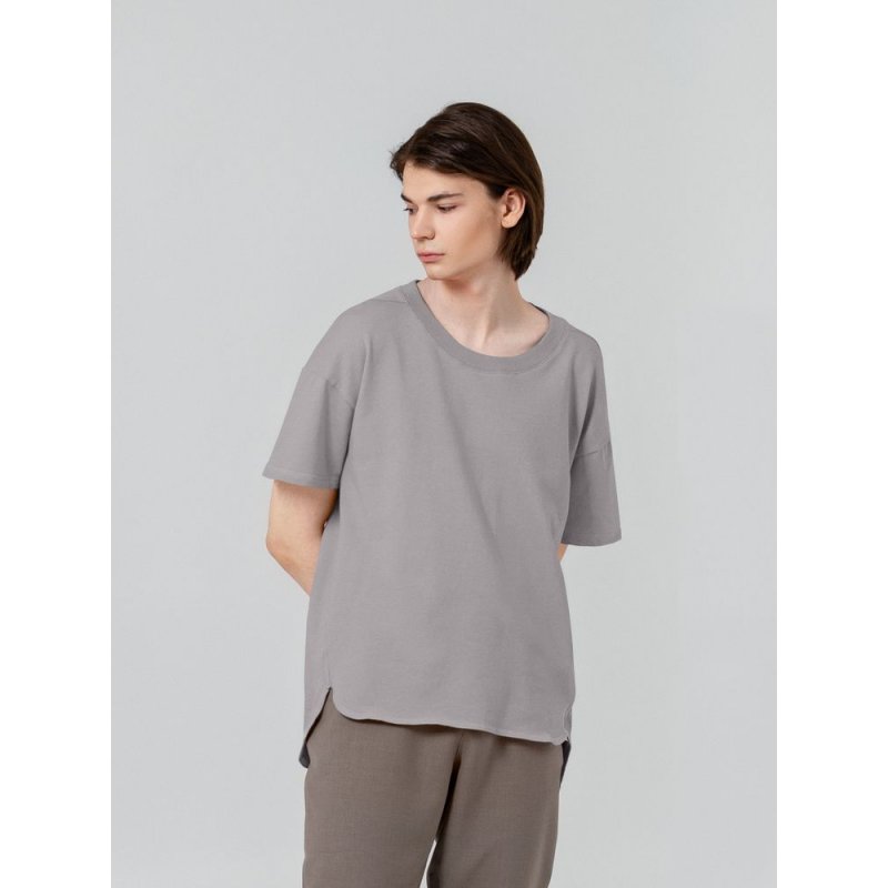 Футболка унисекс свободного кроя со спущенным плечом и смещенными плечевыми и боковыми швами.