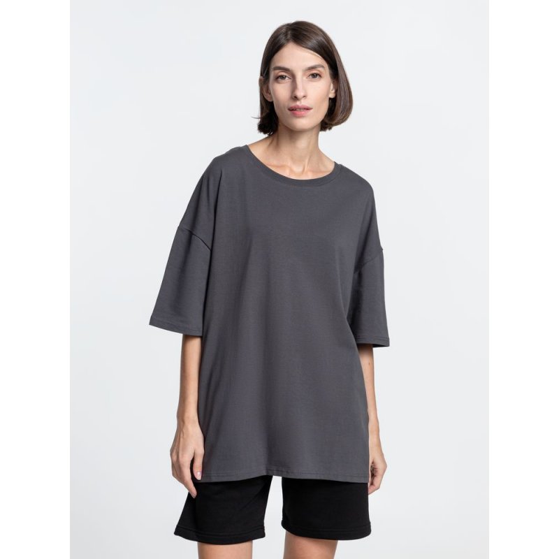 Объемная кроеная футболка с удлиненным рукавом из гребенного хлопка с эластаном не стесняет движений и создает модный расслабленный силуэт.
