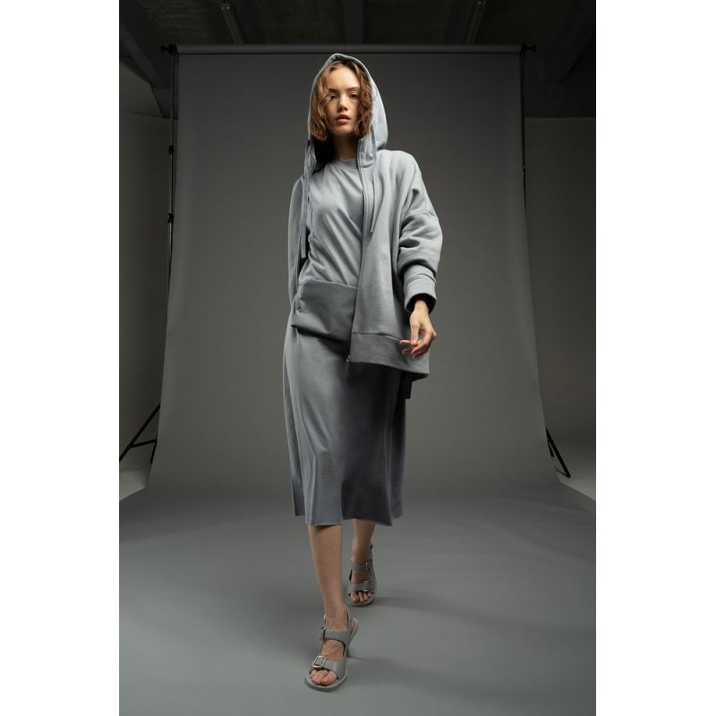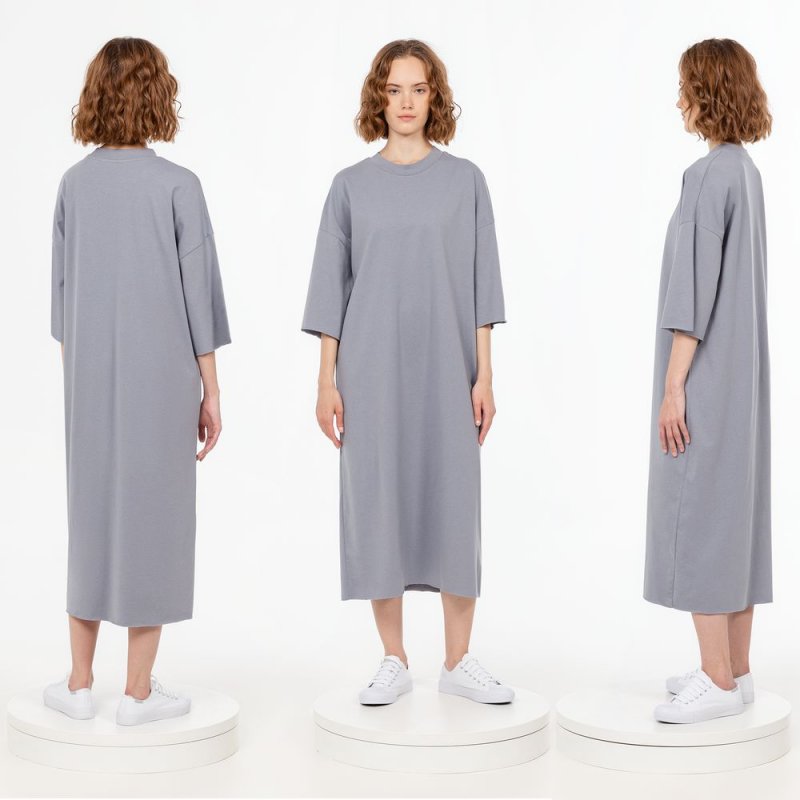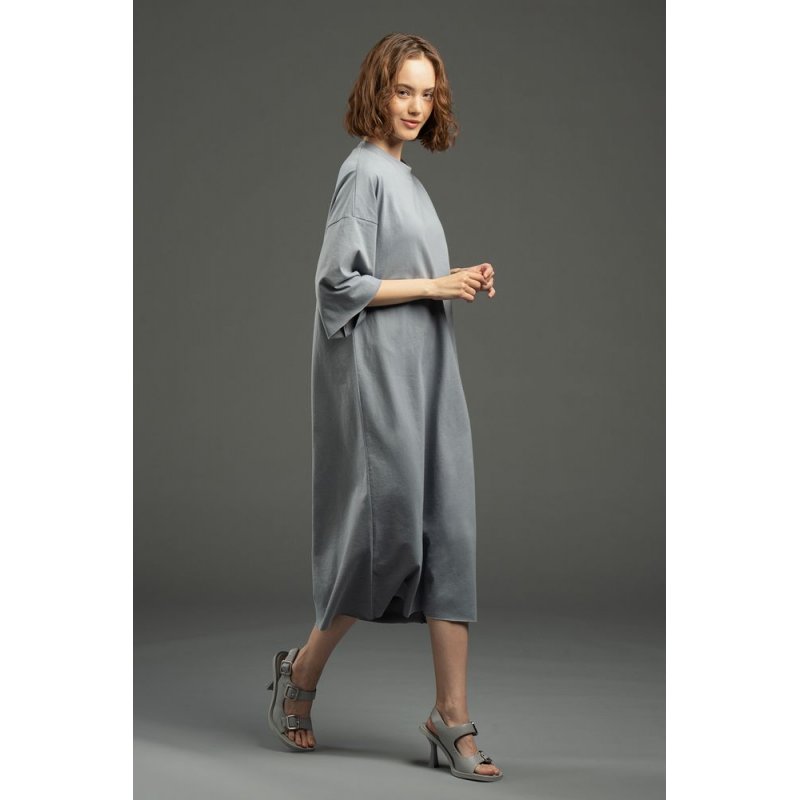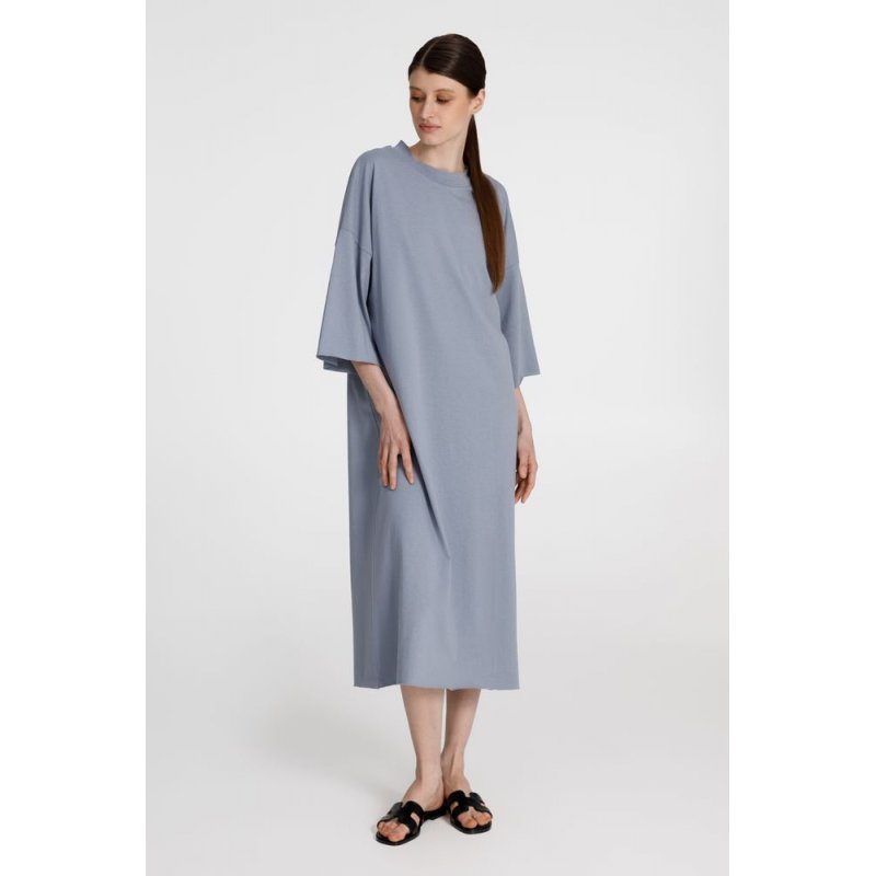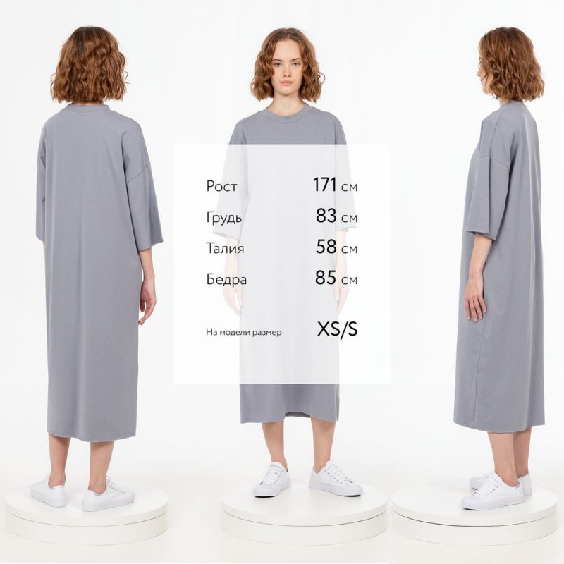 Платье свободного кроя со спущенным плечом.