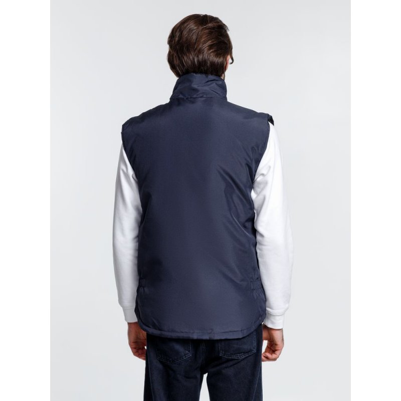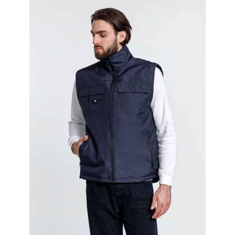 Мужской утепленный жилет с воротником-стойкой и удлиненной спинкой. Выполнен из ткани оксфорд с водоотталкивающим покрытием.
