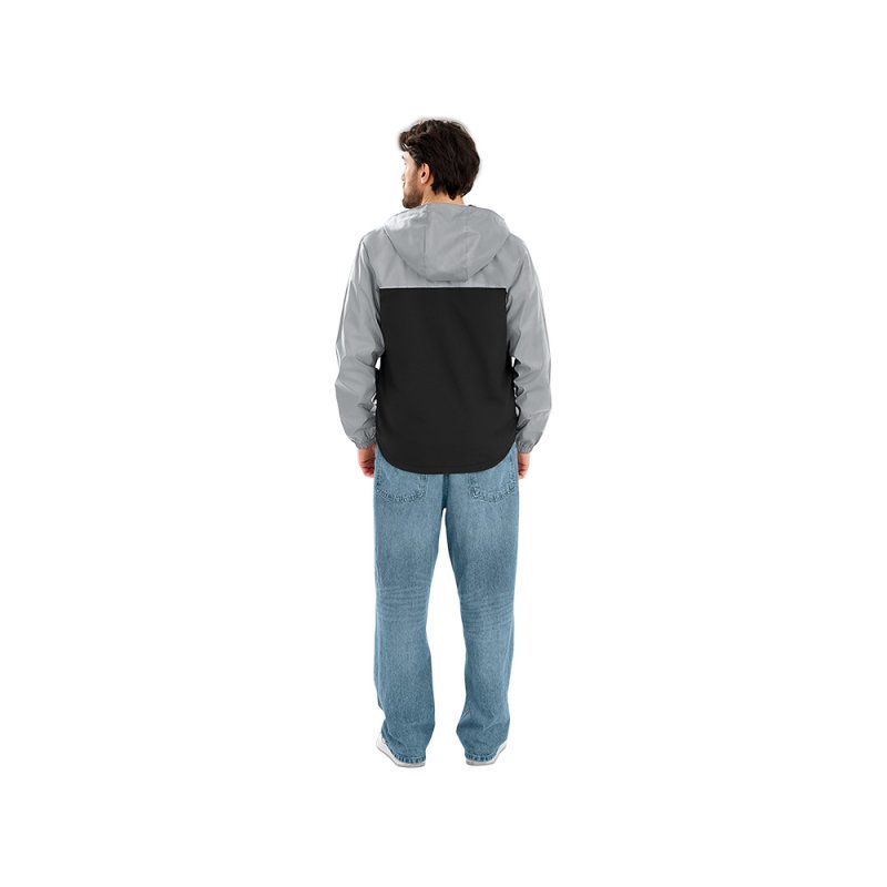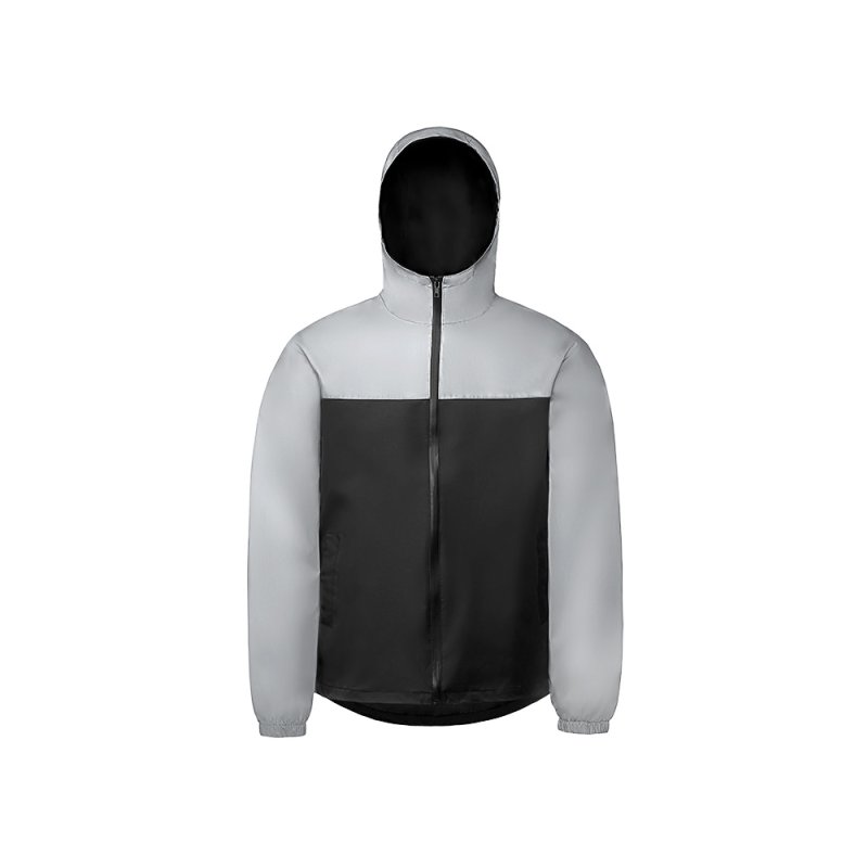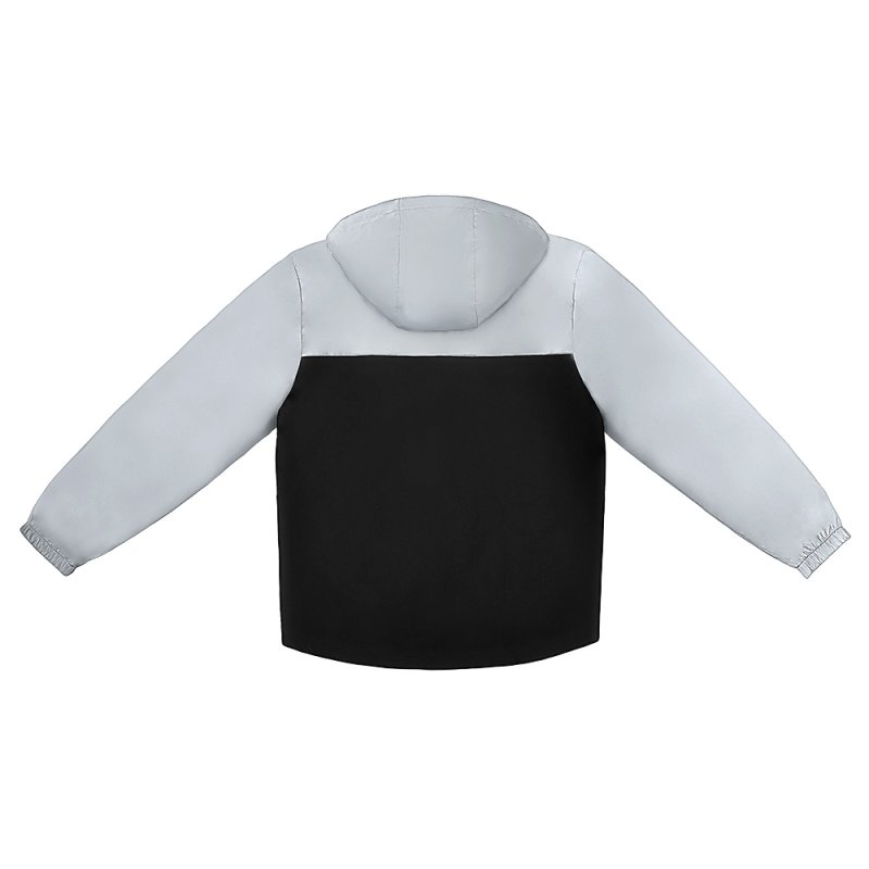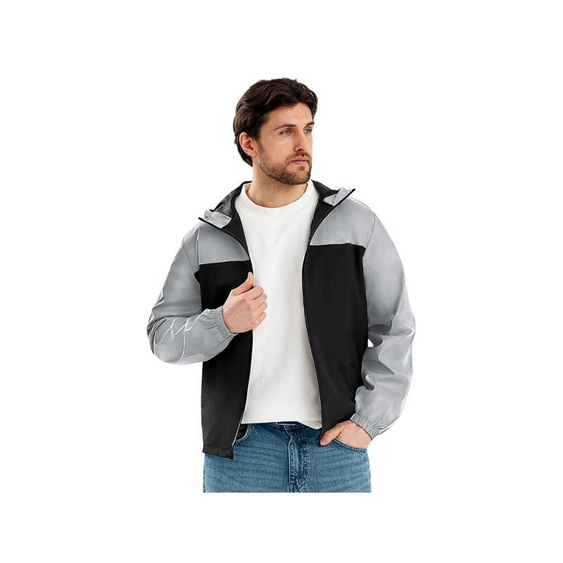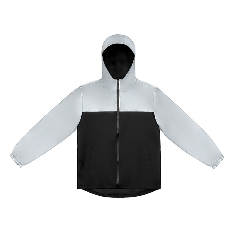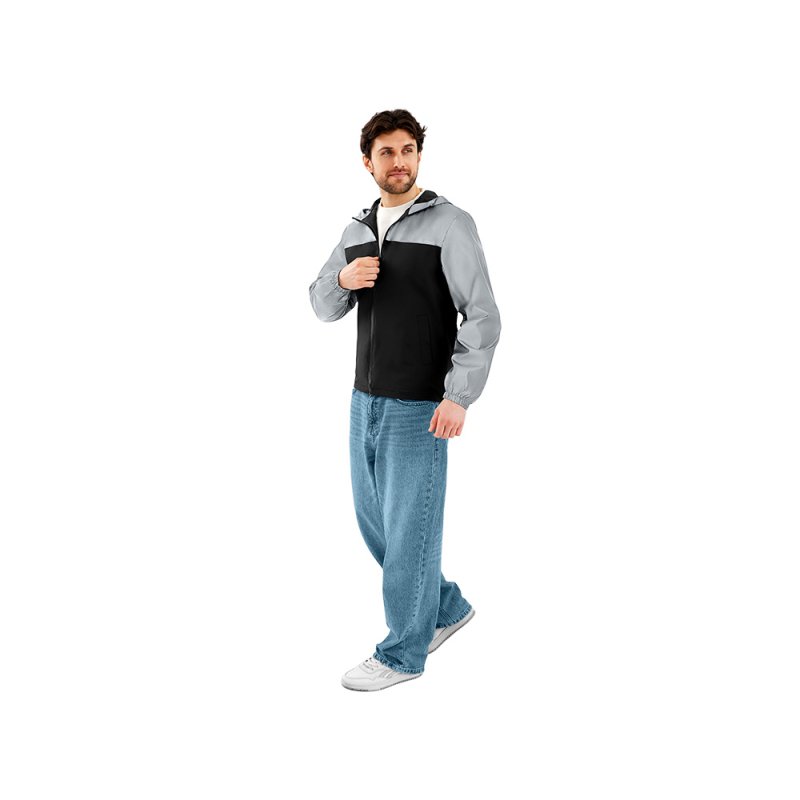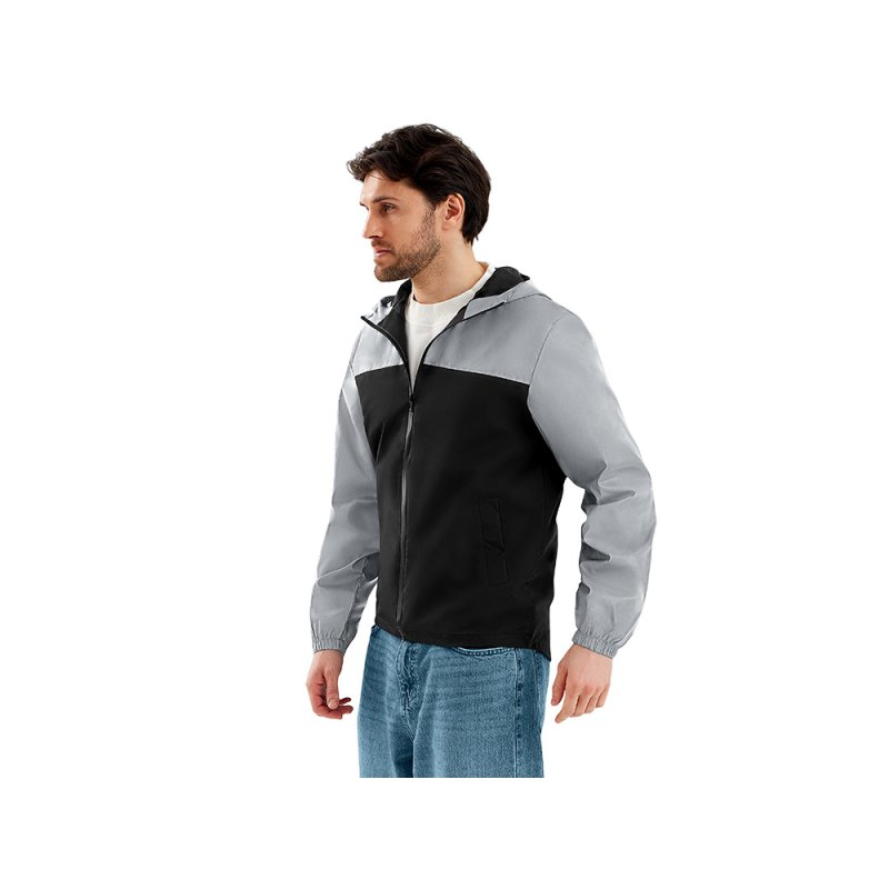 Streetwear-ветровка с контрастным дизайном: верх переда и спинки, рукава и капюшон — из светоотражающей ткани, низ — из прочной чёрной полиэстеровой ткани. Модель на подкладке, со спинкой длиннее переда.