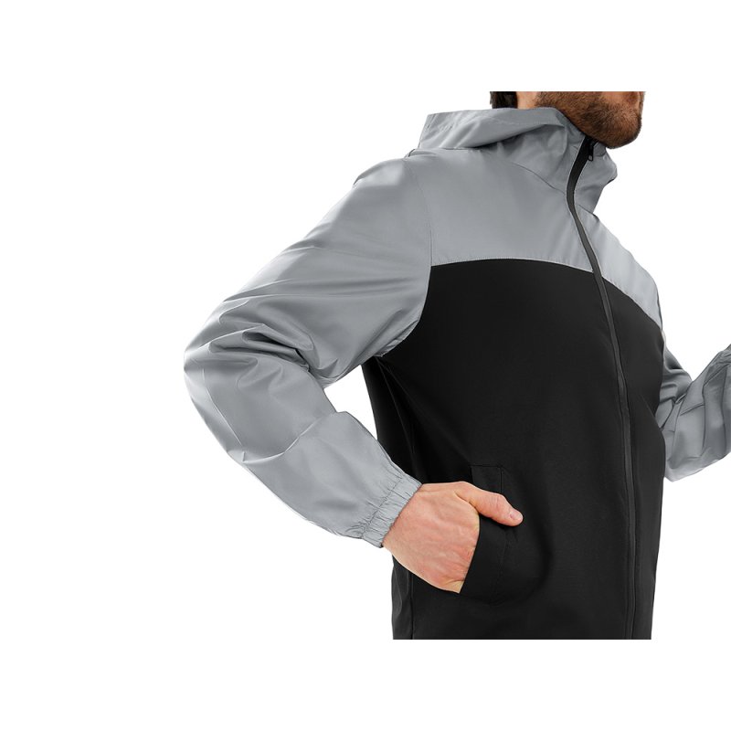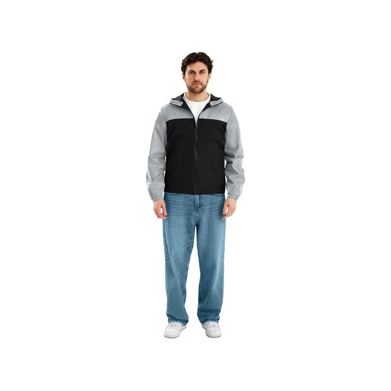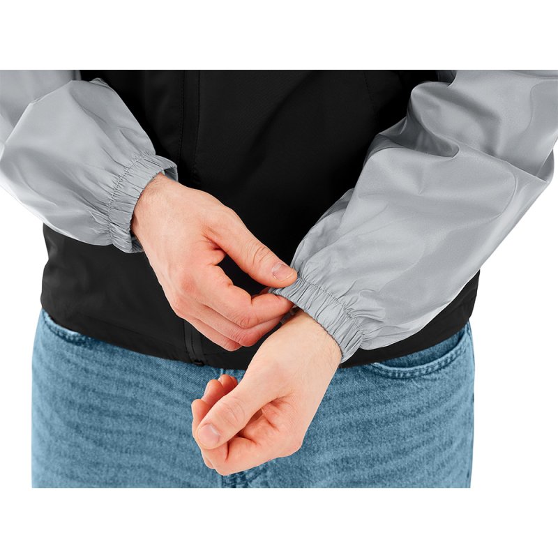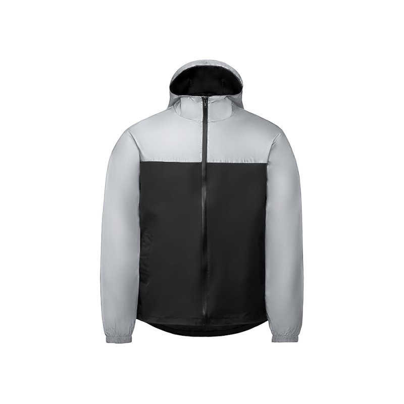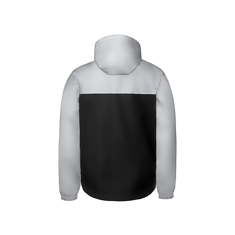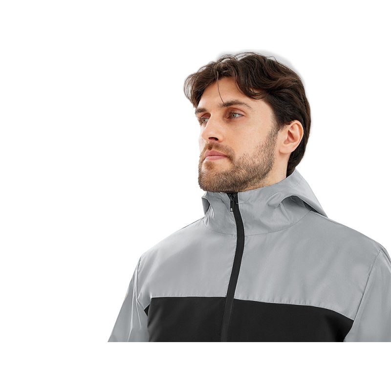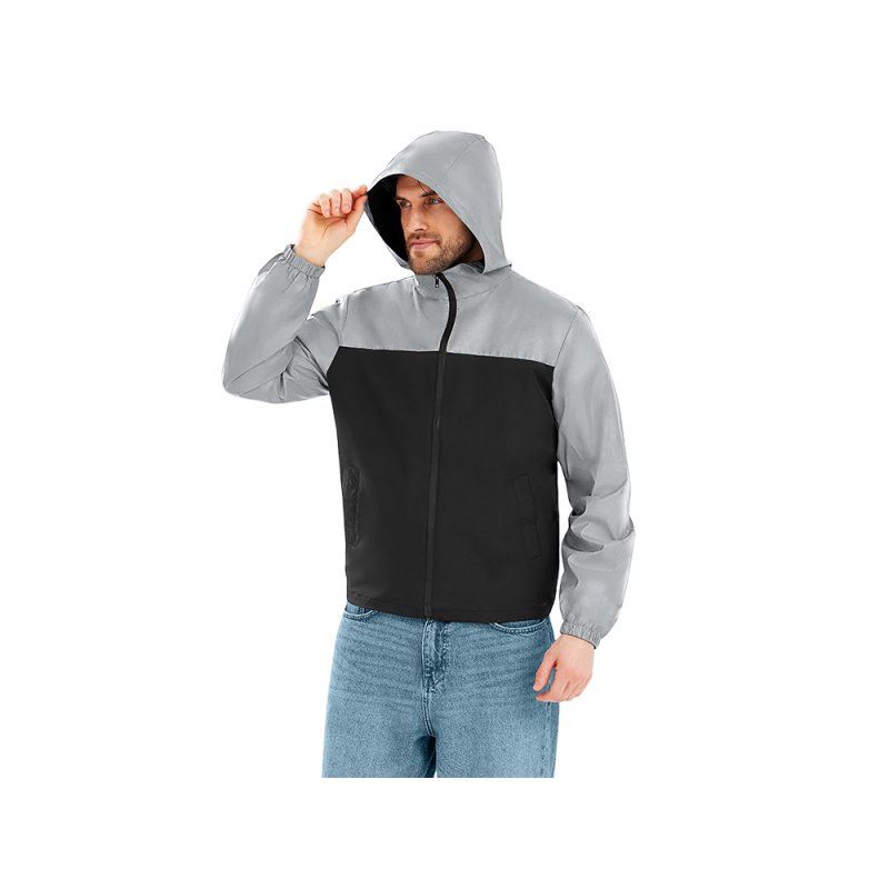 Streetwear-ветровка с контрастным дизайном: верх переда и спинки, рукава и капюшон — из светоотражающей ткани, низ — из прочной чёрной полиэстеровой ткани. Модель на подкладке, со спинкой длиннее переда.