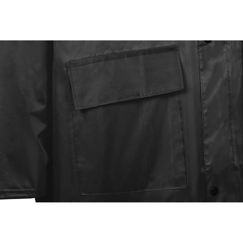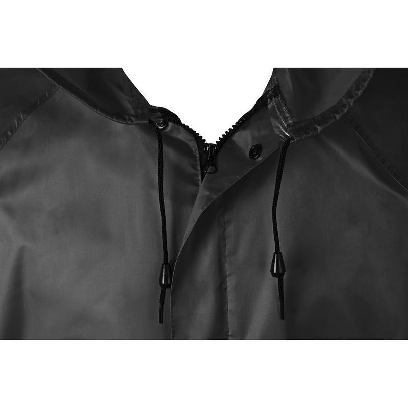 Длинный дождевик выполнен из полиэстера с водоотталкивающей пропиткой. Застегивается на молнию, поверх которой — планка на кнопках, что дополнительно защищает от ветра и промокания. Посадку капюшона можно регулировать при помощи шнурка, ширина рукава регулируется кнопкой.