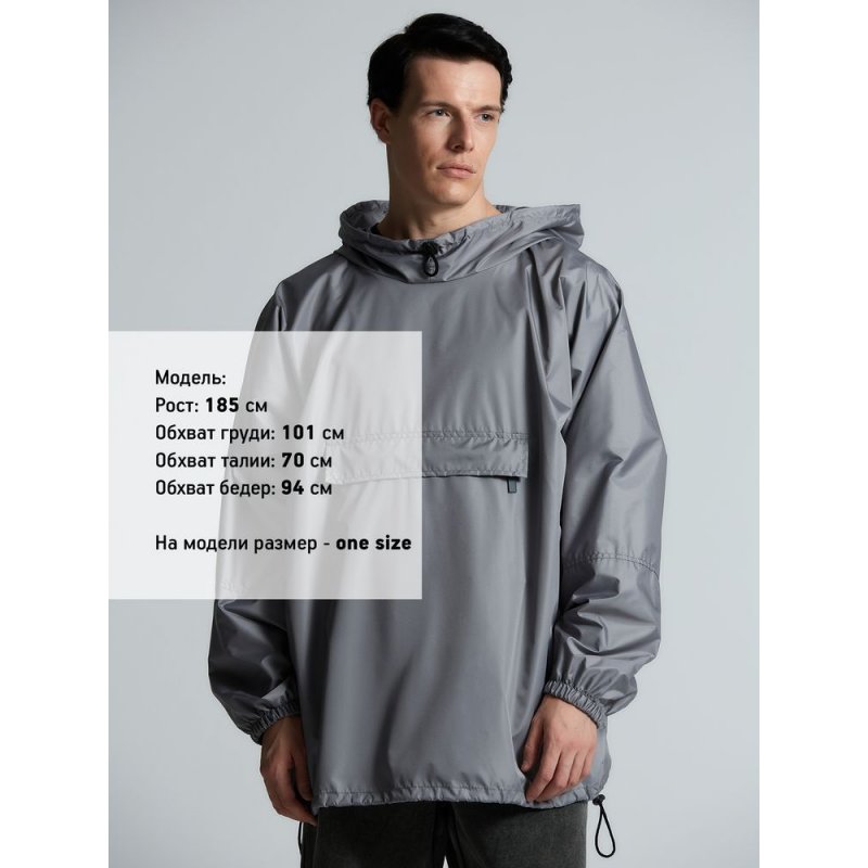 Дождевик-анорак с капюшоном и карманом на молнии спереди. Выполнен из ткани дюспо с матовой поверхностью — легкой, мягкой на ощупь, но устойчивой к повреждениям. Она не шелестит и практически не мнется. Благодаря пропитке дюспо обладает отличными водоотталкивающими и ветрозащитными свойствами.