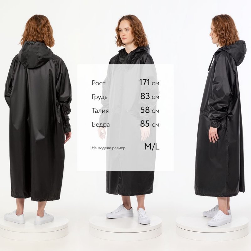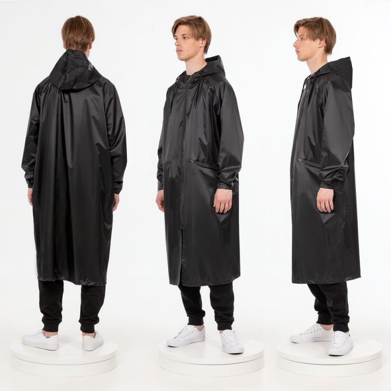 Плащ-дождевик на молнии с капюшоном из ткани таффета с полиуретановой пропиткой для защиты от сильного дождя.