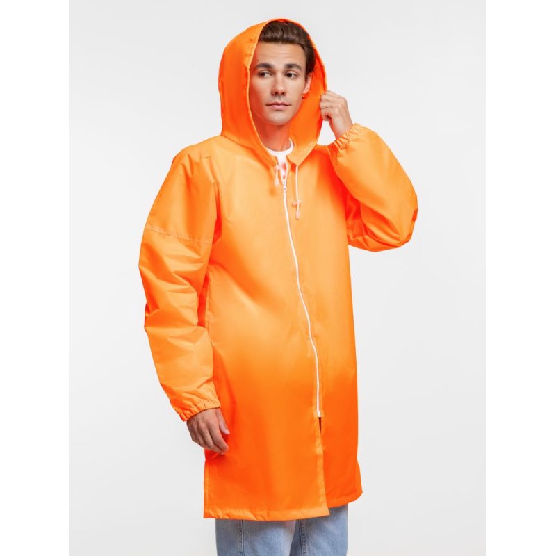 Плащ-дождевик из ткани таффета на молнии с капюшоном. Складывается в мешочек — удобно брать с собой.