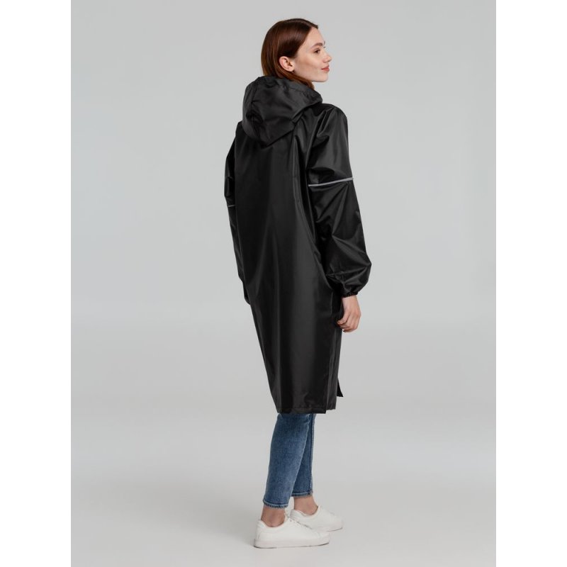 Плащ-дождевик из ткани оксфорд на кнопках с капюшоном. Световозвращающие элементы на рукавах и планке позволяют быть замеченным в темное время суток.