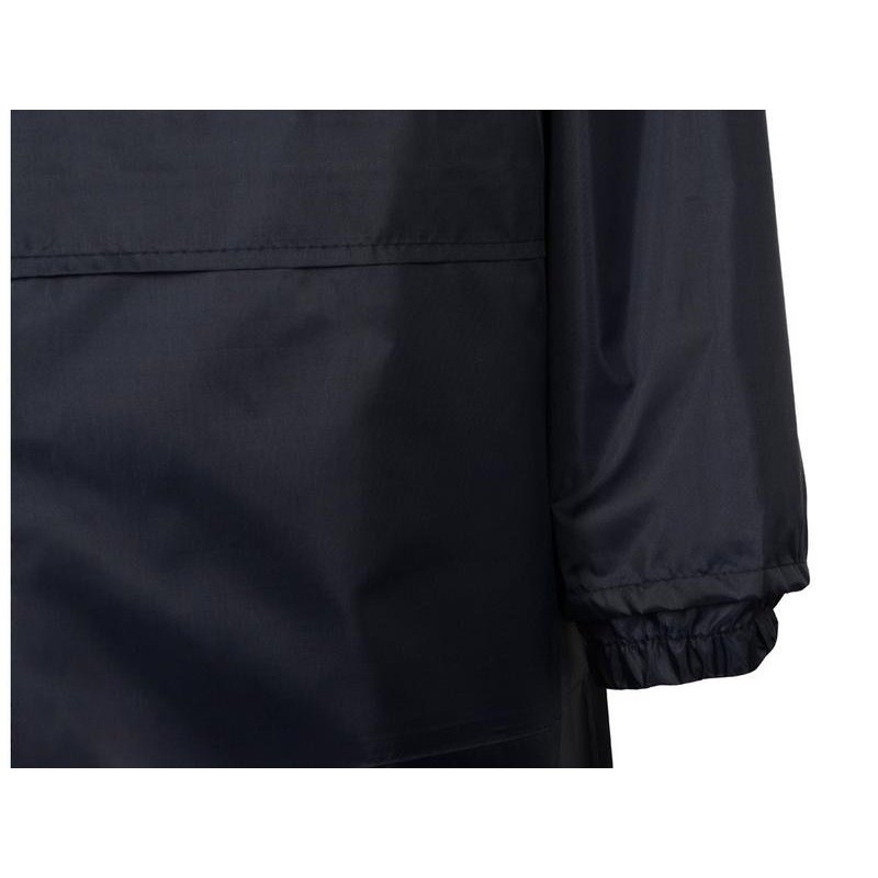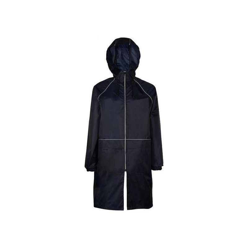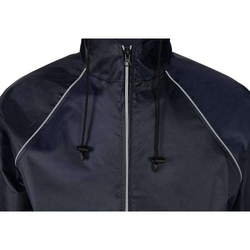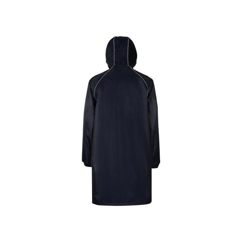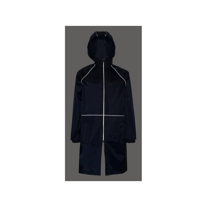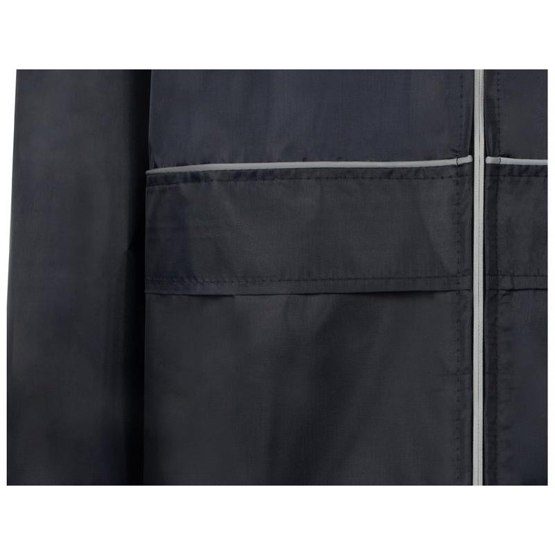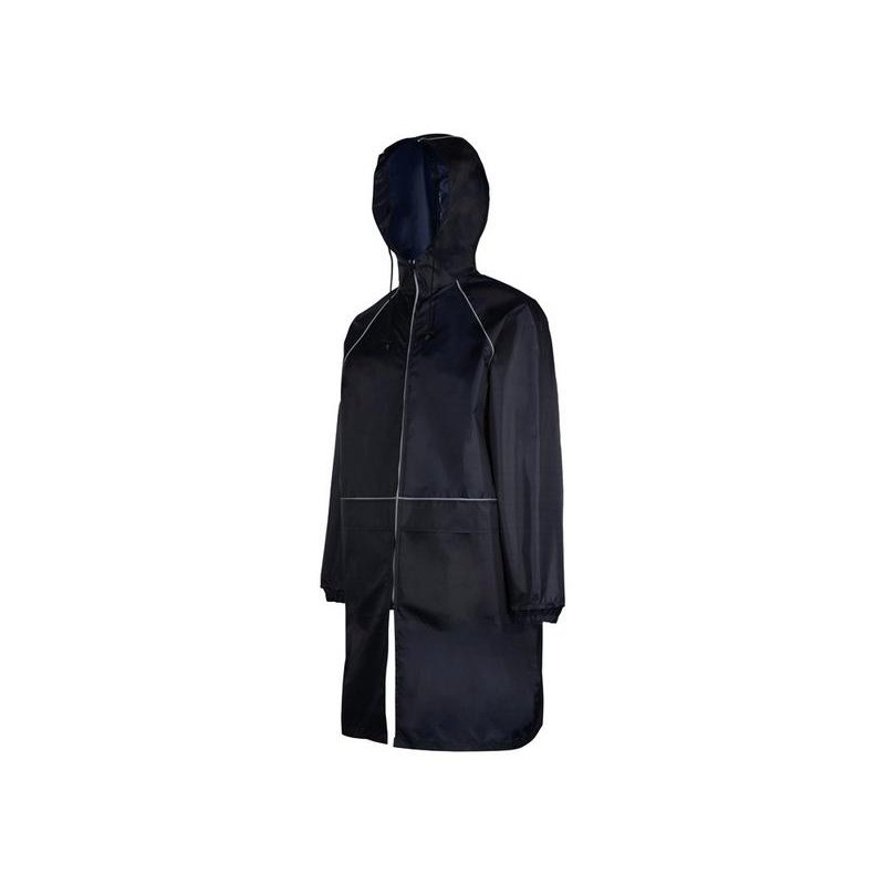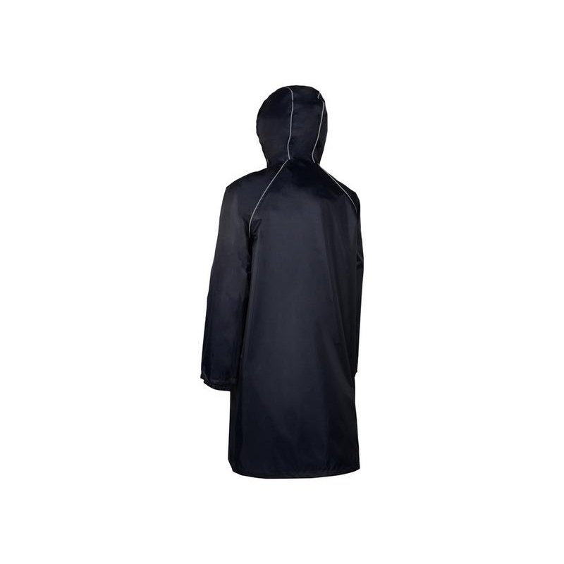 Плащ-дождевик прямого силуэта с капюшоном и рукавом реглан. Застегивается на центральную молнию со светоотражающей полосой с внутренней ветрозащитной планкой. Накладные карманами с клапанами. Двухшовный капюшон с кулиской по краю. Низ рукавов обработан манжетами с внутренней резинкой для комфортной посадке в области запястья. Верхний край клапана кармана, швы капюшона, а также регланные линии обработаны светоотражающим кантом.