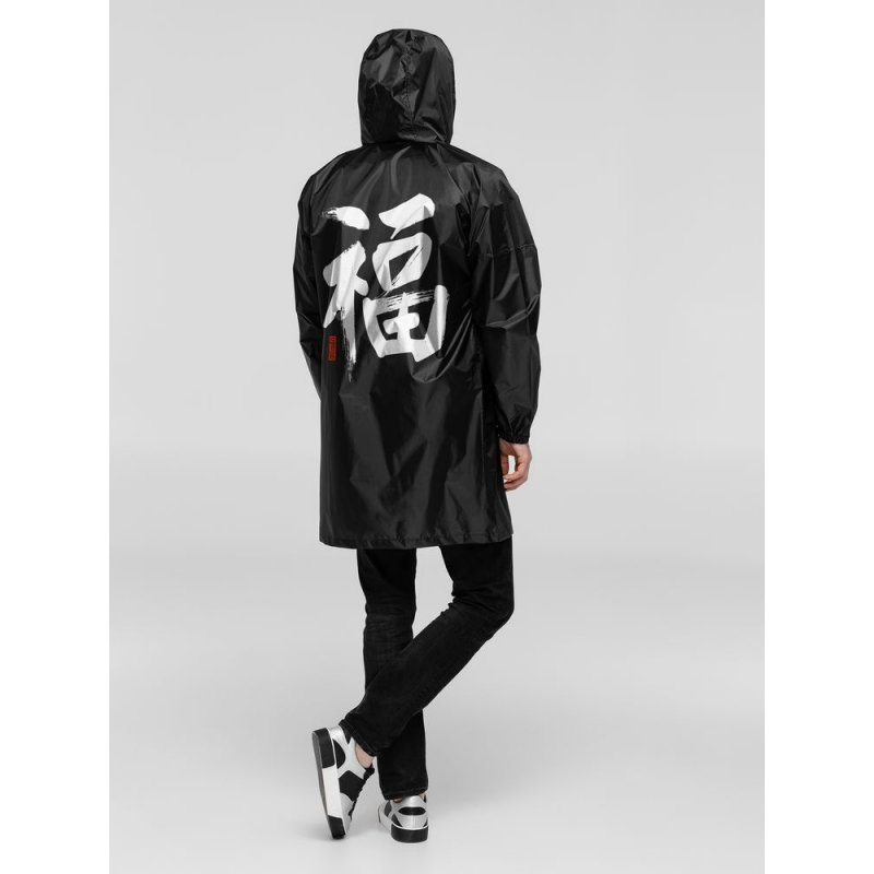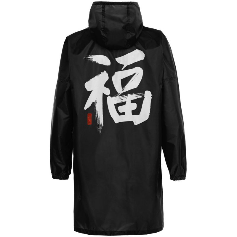 Иероглифы коллекции «Вечные ценности» выполнены в жанре каллиграфии на древнекитайском диалекте мандарин. Плавные линии символизируют внутренний баланс и фокусировку на главных жизненных ориентирах.Плащ-дождевик из ткани таффета на молнии с капюшоном. Складывается в мешочек — удобно брать с собой.