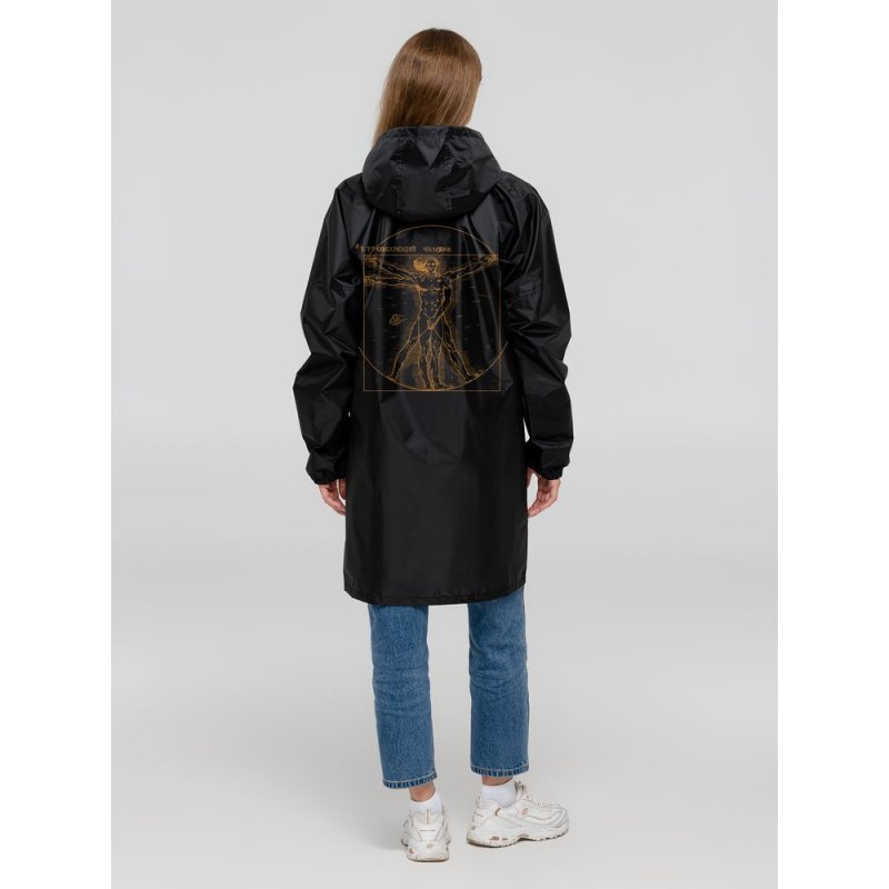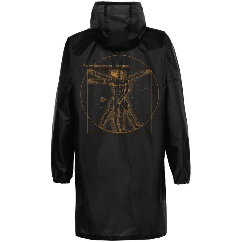 Ветреная погода может внести свои коррективы даже в идеальную симметрию! Сильный порыв — и человек с картины Леонардо да Винчи стал ВЕТРОвианским. Главное — успеть удержать фиговый листочек на нужном месте.Плащ-дождевик из ткани таффета на молнии с капюшоном. Складывается в мешочек — удобно брать с собой.