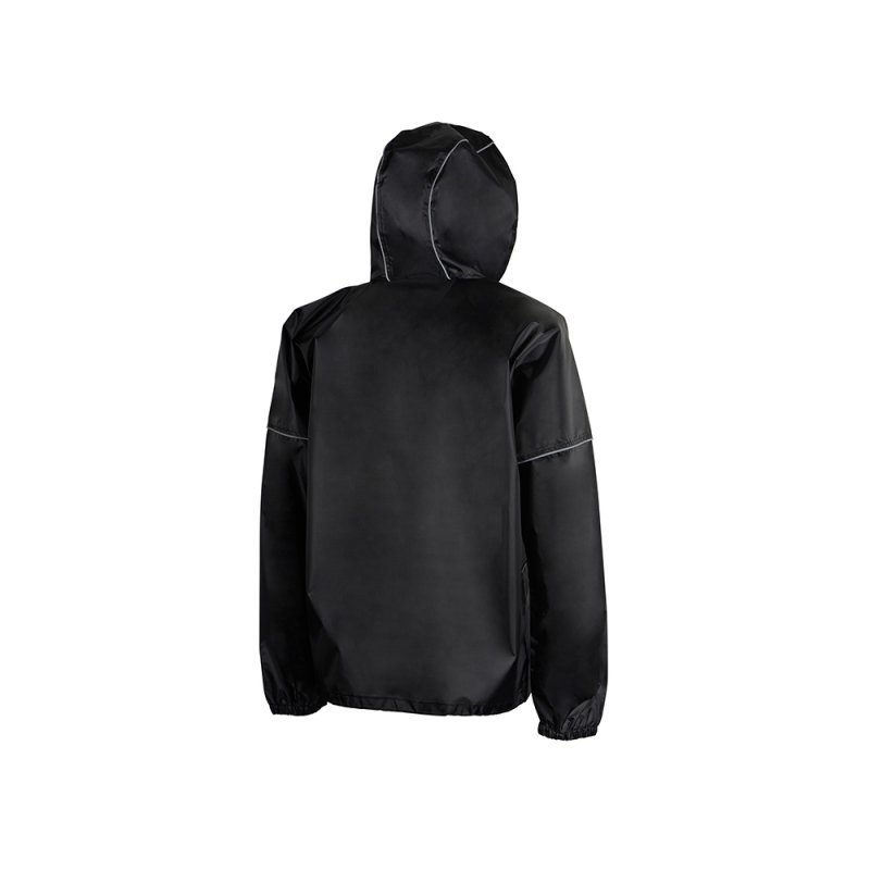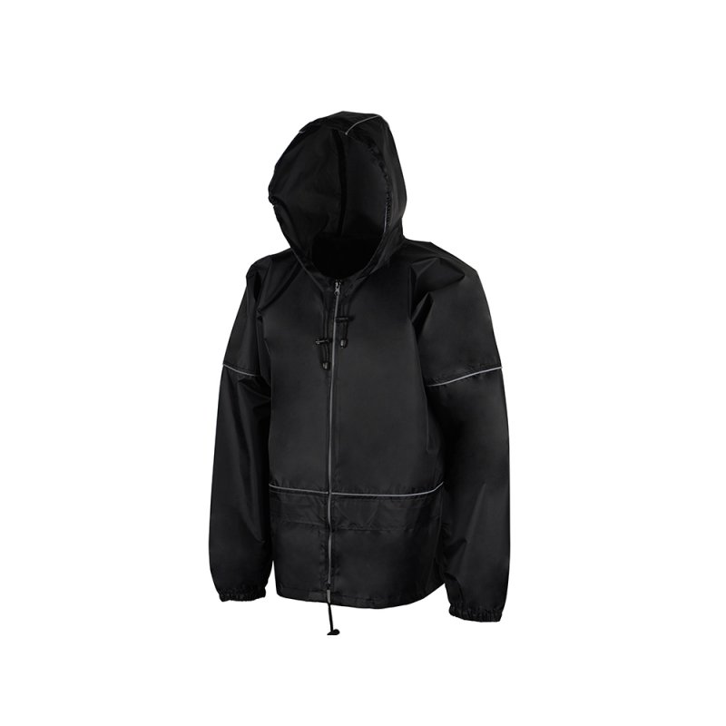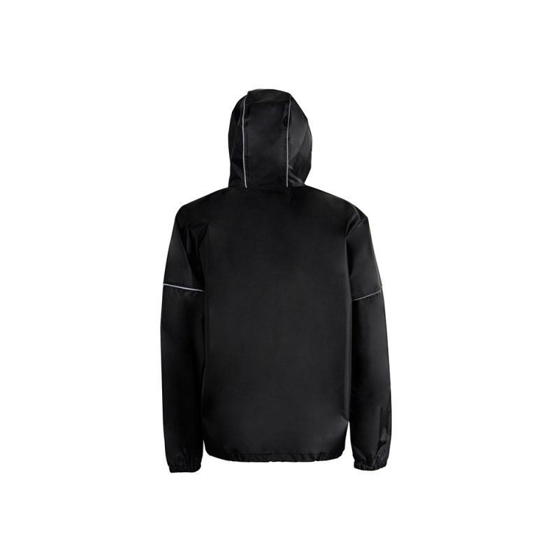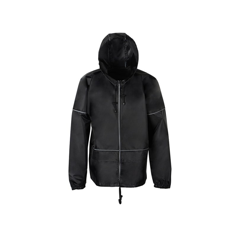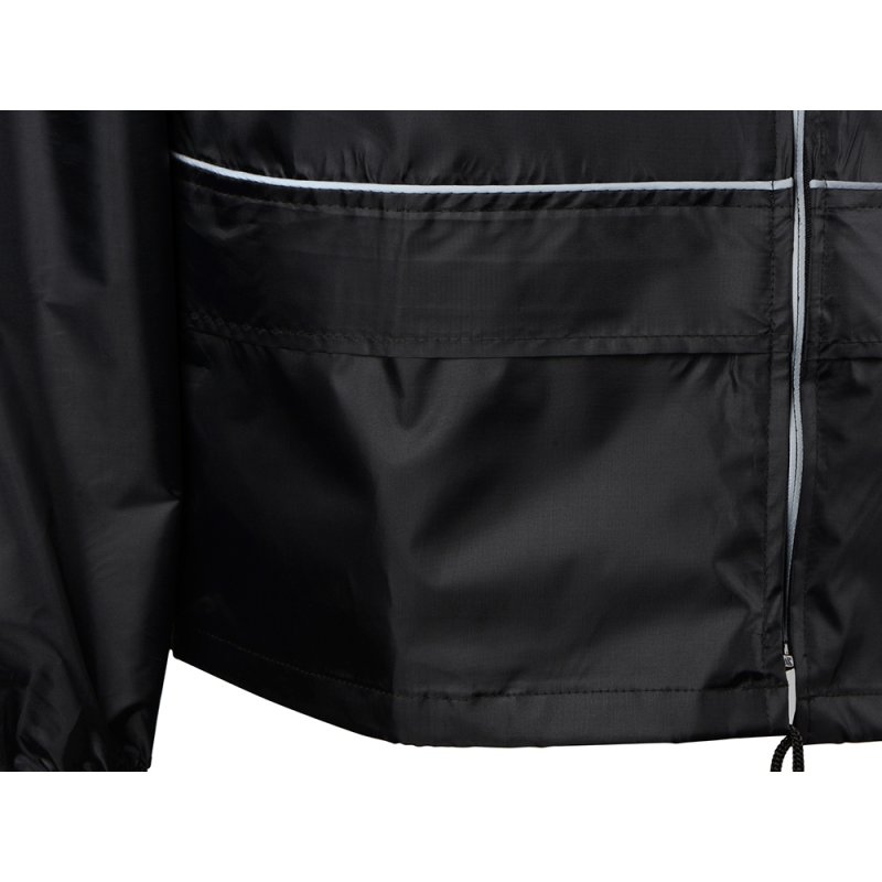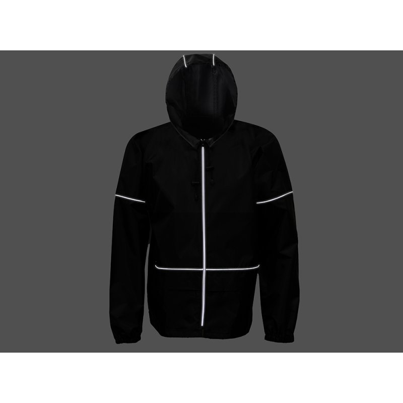 Короткий дождевик прямого силуэта с капюшоном и карманами. Вместительные накладные карманы защищены сверху клапанами, по верхней кромке которых вшит светоотражающий кант. Светоотражающие элементы также расположены на рукавах, капюшоне и молнии, что делает человека заметным даже в темное время суток.