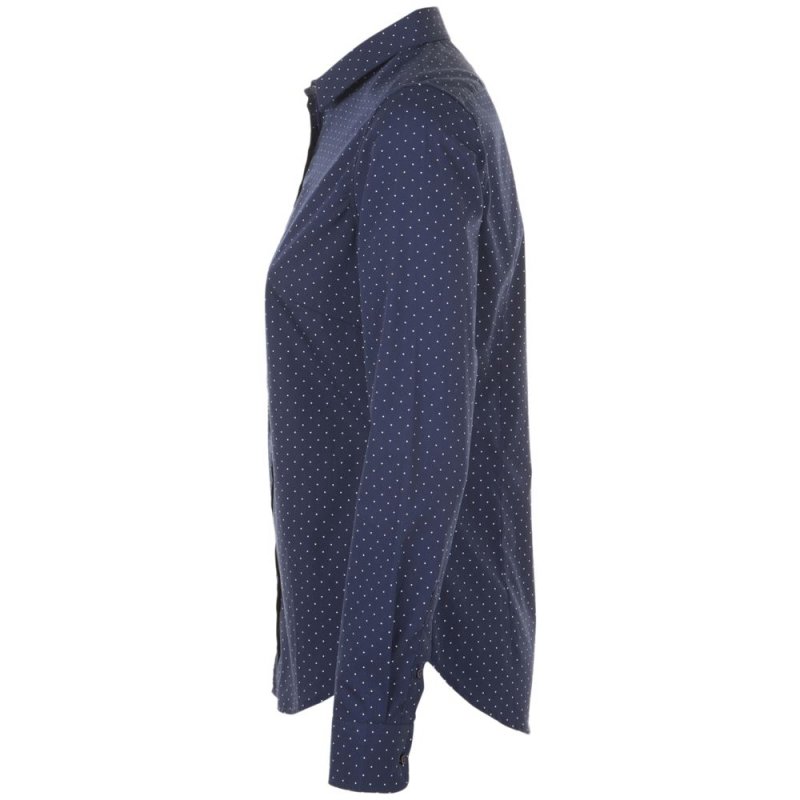 Модная рубашка с печатным рисунком в горошек, которая прекрасно впишется в современный корпоративный стиль.Приталенная модель с нагрудными вытачками, маленьким классическим воротничком, планкой с 7 пуговицами тон в тон и манжетами на 1 пуговице с разрезом «капуцин».