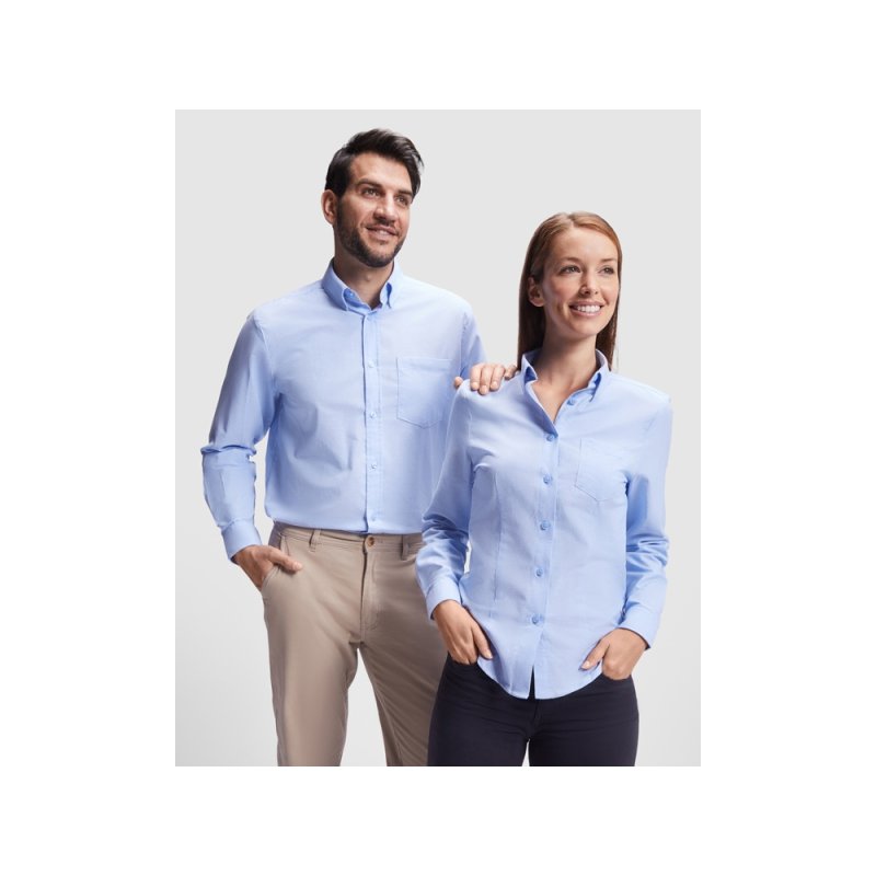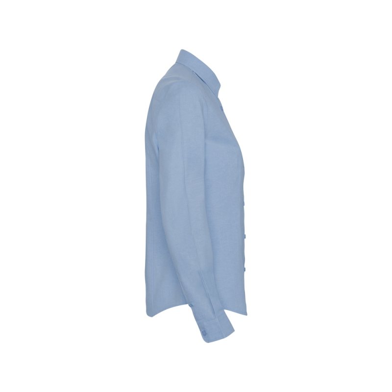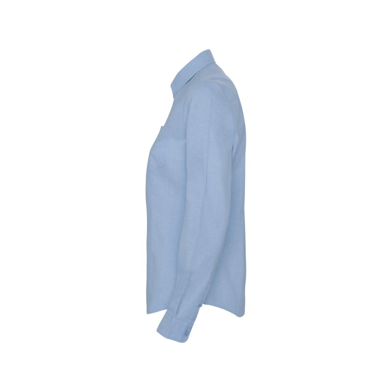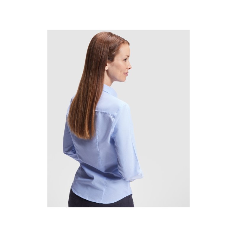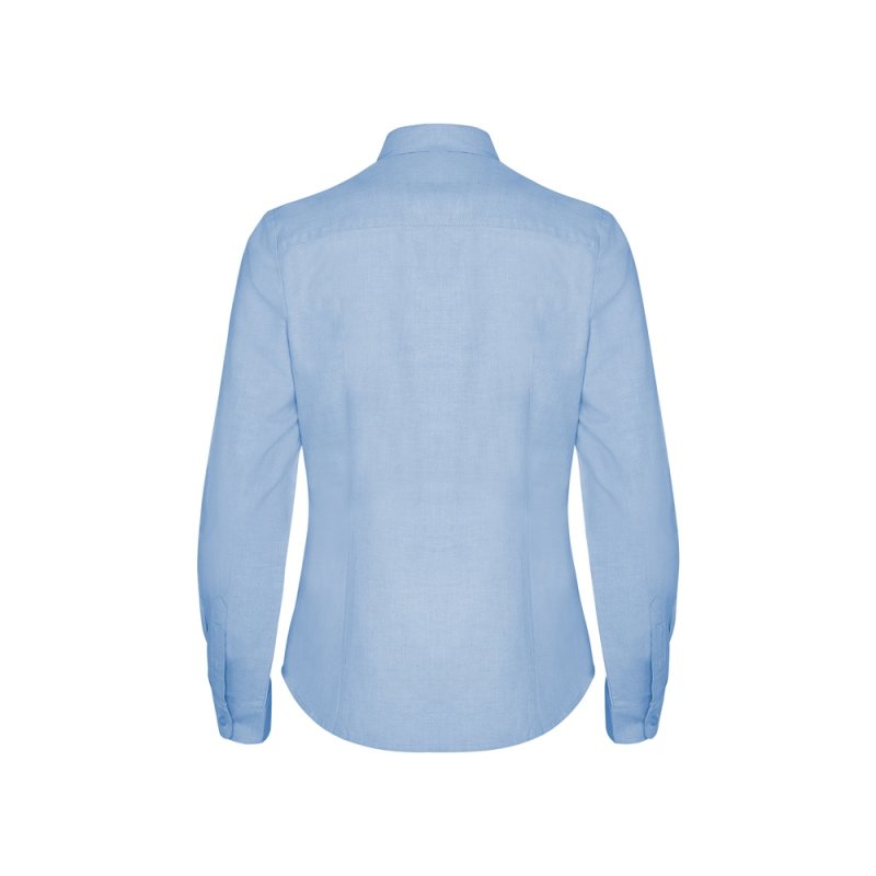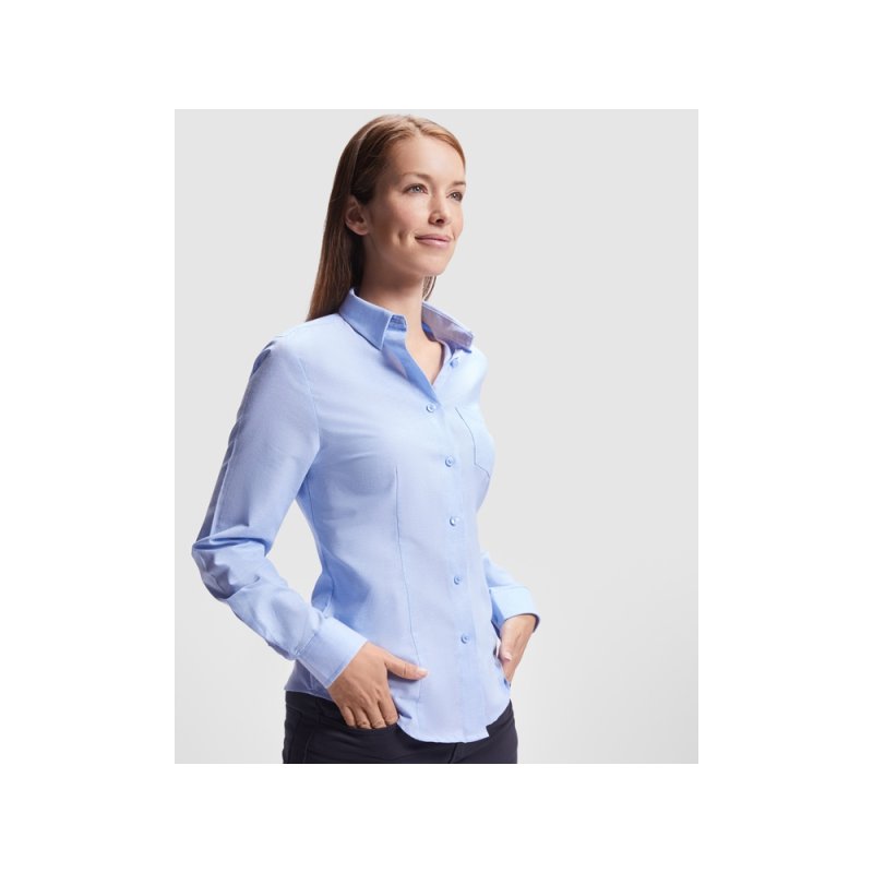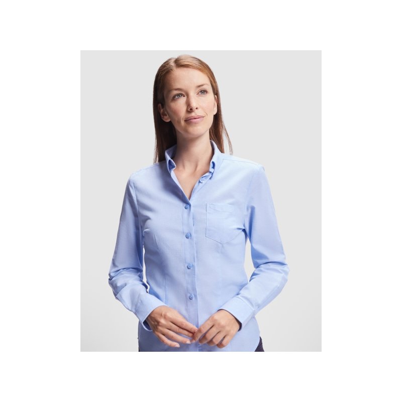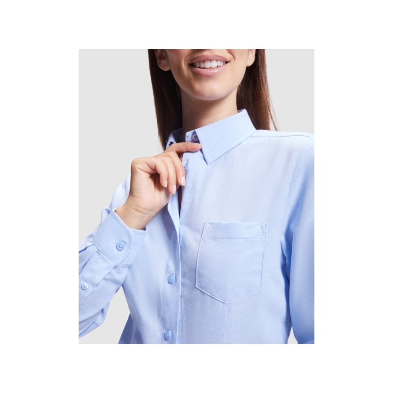 Женская рубашка с длинным рукавом, накладной карман слева. Планка на пуговицах. Отложной воротник на стойке, могут встречаться изделия, где воротник продублирован пуговицами. Манжета регулируется по ширине с помощью 2-х пуговиц. Кокетка на спинке.