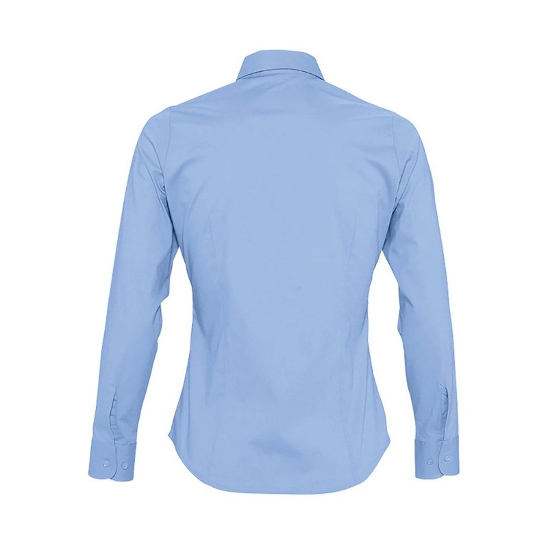 Рубашка приталенного кроя с воротником на одной пуговице. Планка на 7 пуговиц в тон, манжеты на 2 пуговицах, вытачки спереди и на спинке.