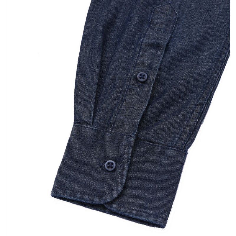 Модель классического кроя из денима с воротником на пуговицах, планкой на 7 пуговиц в тон и манжетами на 1 пуговице.
