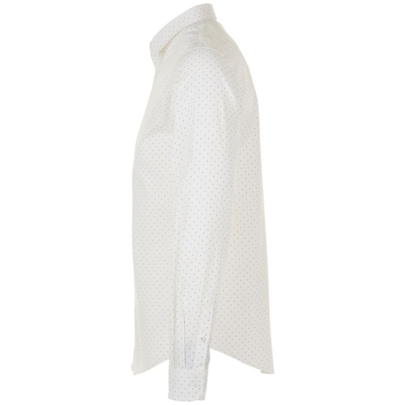 Модная рубашка с печатным рисунком в горошек, которая прекрасно впишется в современный корпоративный стиль.Облегающая модель с маленьким классическим воротничком, планкой с 7 пуговицами тон в тон и манжетами на 1 пуговице с разрезом «капуцин».