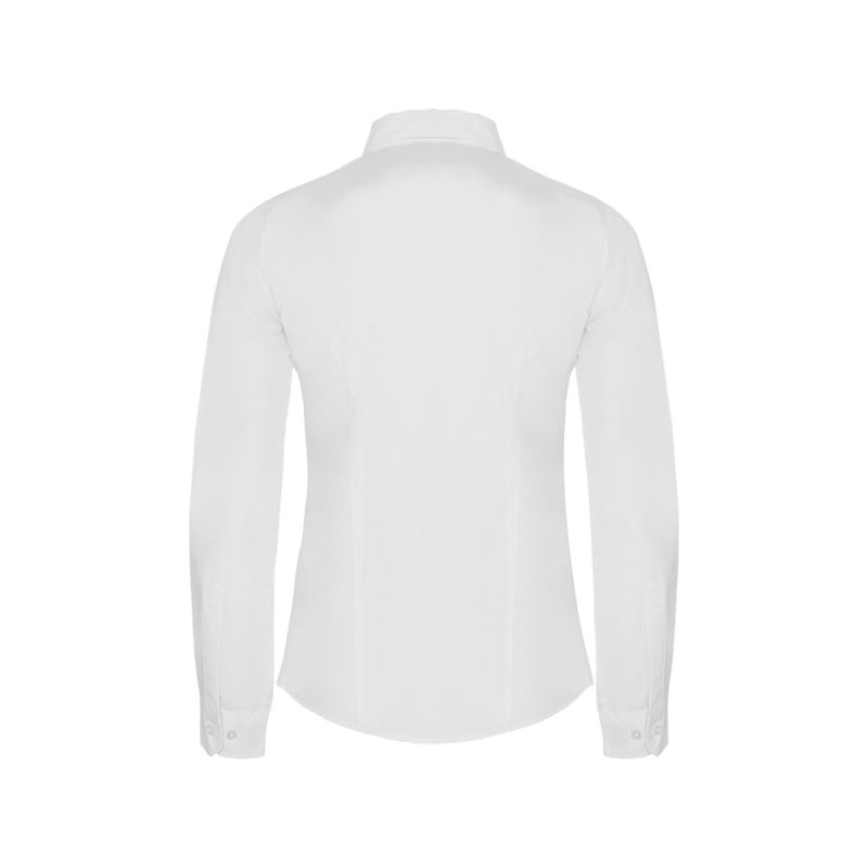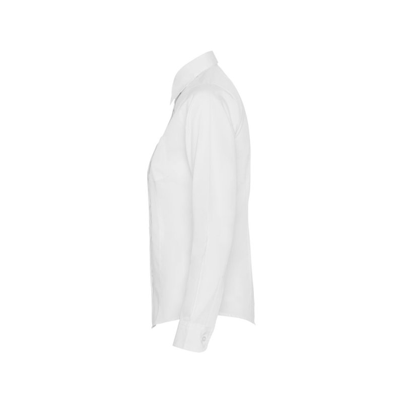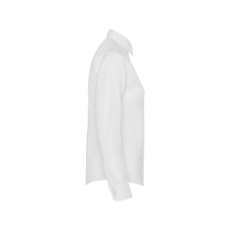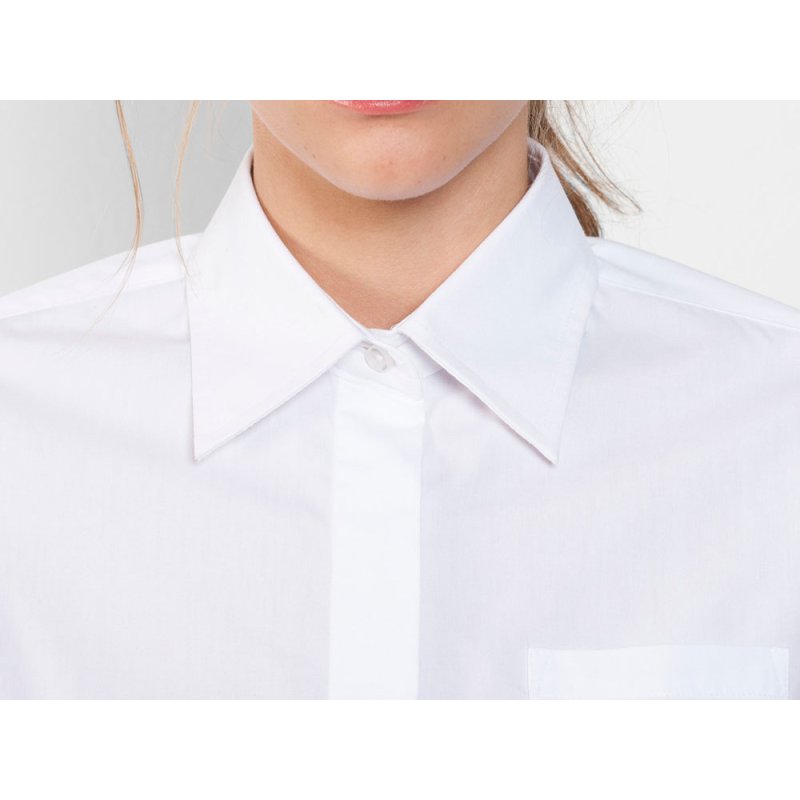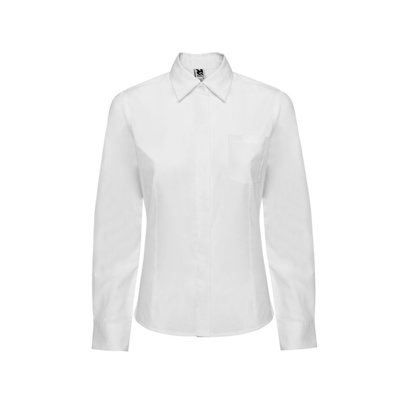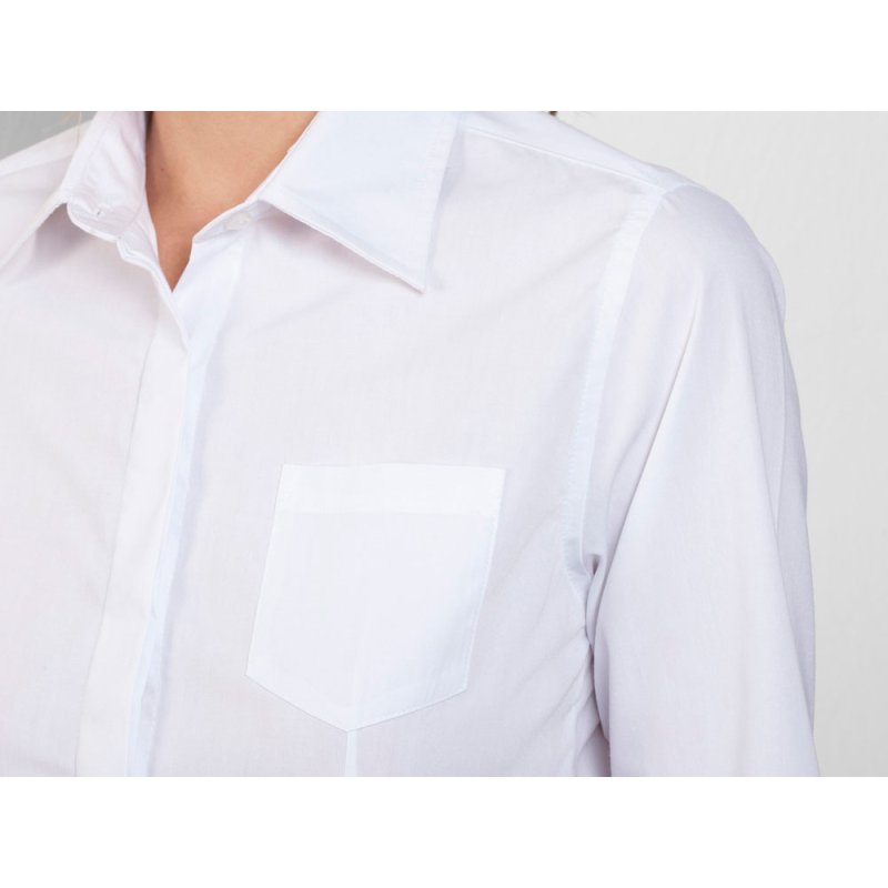 Рубашка женская прилегающего силуэта с длинным рукавом, вытачки на полочке и спинке. Накладной карман на груди слева, закругленный низ изделия. Планка с потайными пуговицами.
