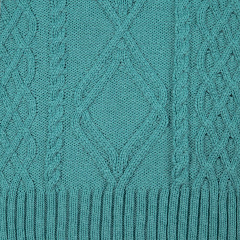 Модель: однотонный жилет крупной вязки с узорами в виде кос. Силуэт оверсайз, спущенное плечо.
