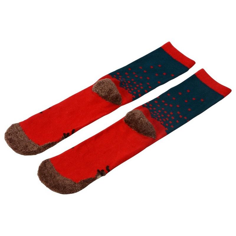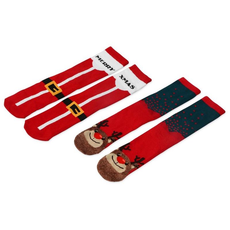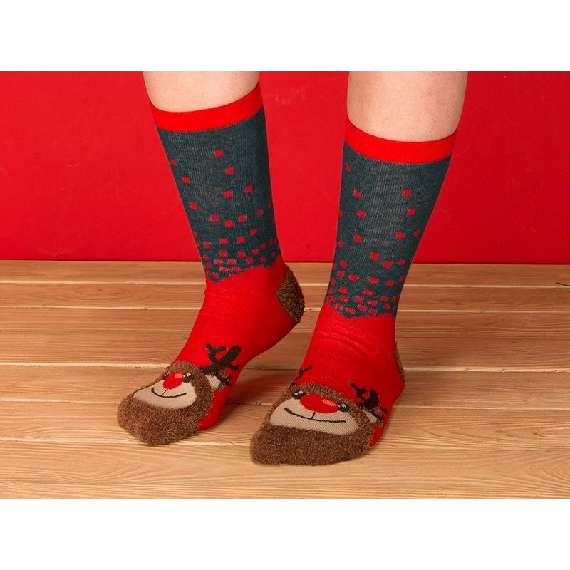 Рождественские носки прекрасно подойдут на роль подарка, который создает праздничное настроение. Этот набор состоит из двух пар, которые упакованы в мешочек из натурального хлопка. Одна пара украшена мягкими пушистыми мордочками рождественских оленей, а принт на второй изображает сапожки Санта Клауса. Ткань -- смесь хлопка, полиэстера и спандекса, что обеспечивает носкам износостойкость, а мягкая широкая резинка – удобную посадку по ноге. Мешочек-упаковку можно брендировать по вашему желанию.
