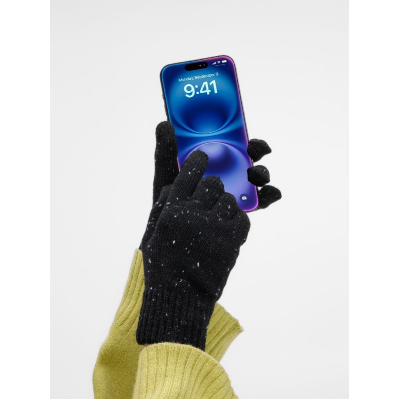 Перчатки Spotti Senso с токопроводящими волокнами на кончиках пальцев позволяют легко управлять смартфоном в любой мороз. Эргономичный крой и эластичная пряжа обеспечивают удобную посадку, сохраняя тепло и свободу движений. Как и в шапке, здесь использованы контрастные нити — визитная карточка коллекции.
