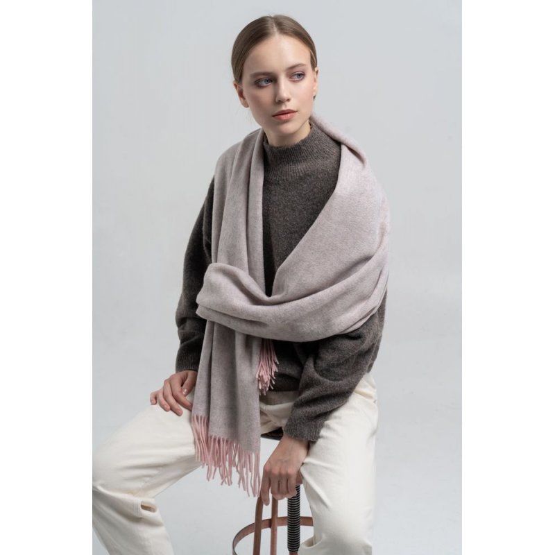 Широкий палантин с едва заметным узором плетения открывает простор фантазии — его можно использовать как шарф, головной убор или декоративный элемент для верхней одежды.