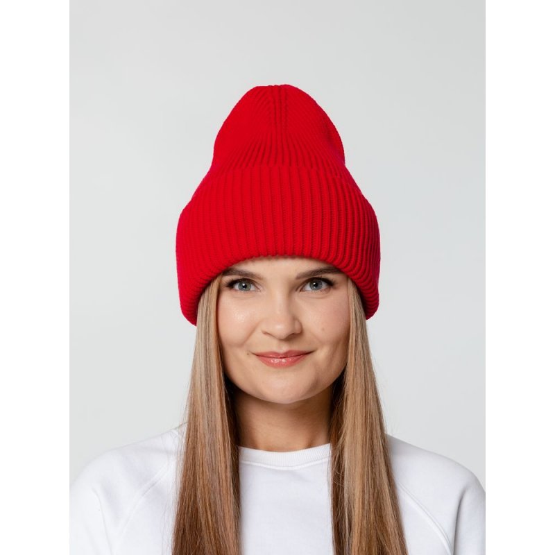 Удлиненная шапка объемной фактурной вязки с отворотом.