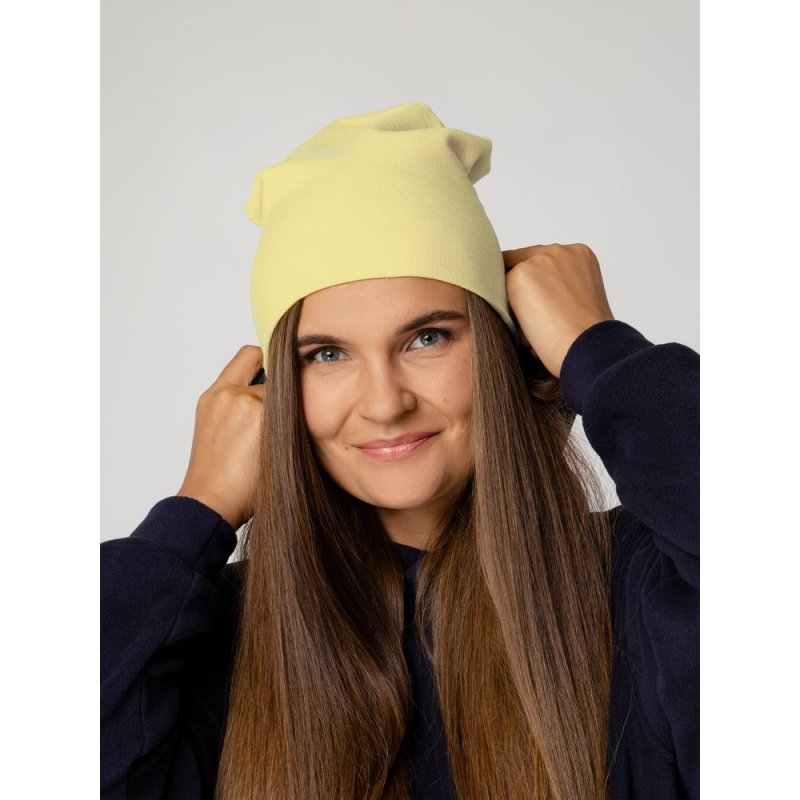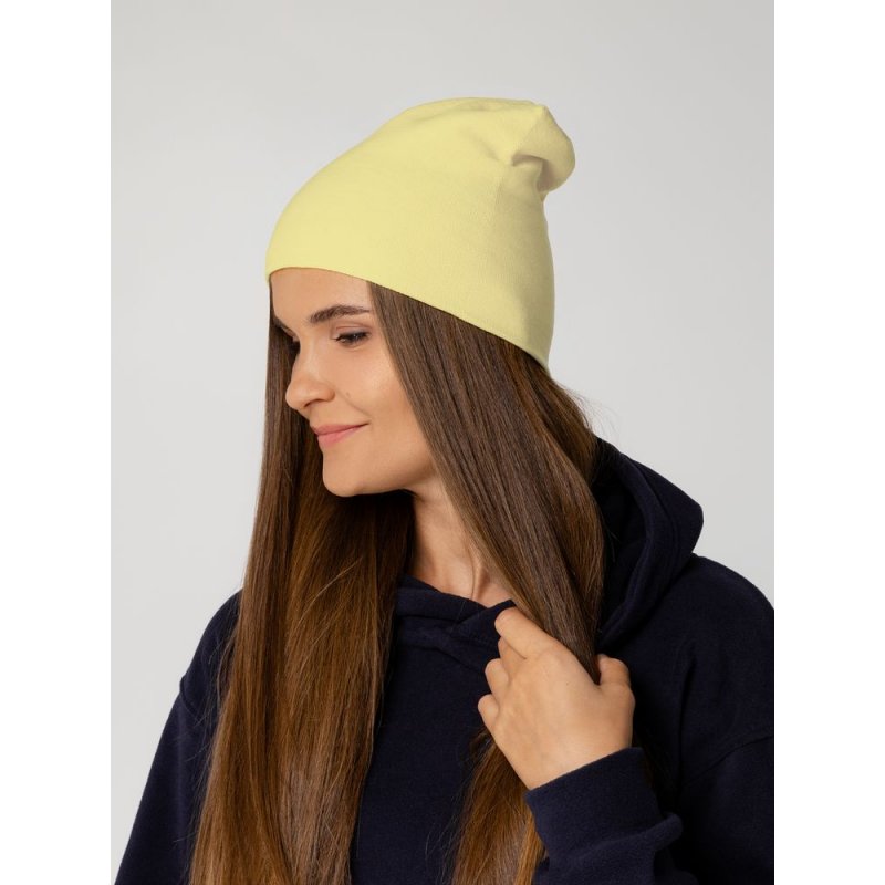 Двухслойная шапка-бини тонкой вязки, которую можно носить как с подворотом, так и без.