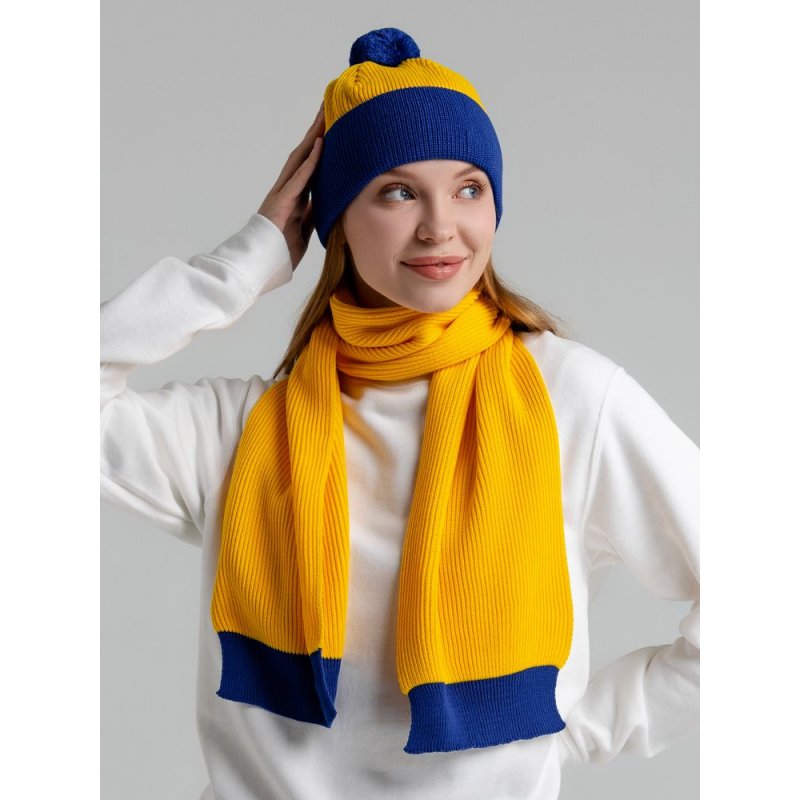 Двуслойная шапка фактурной вязки с контрастным подворотом и помпоном.