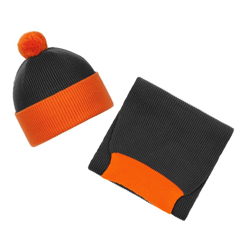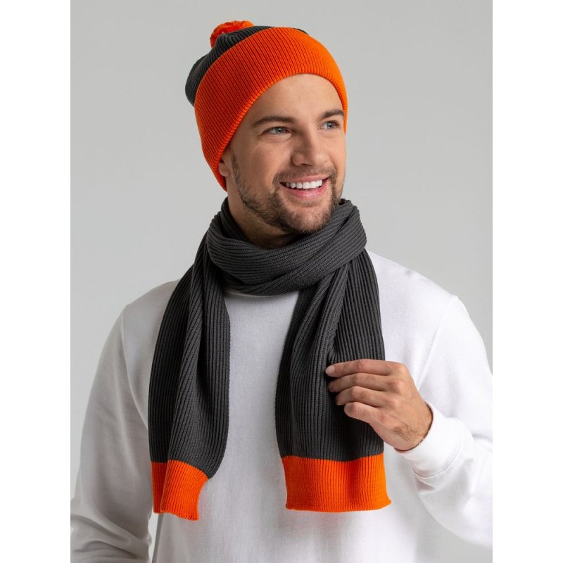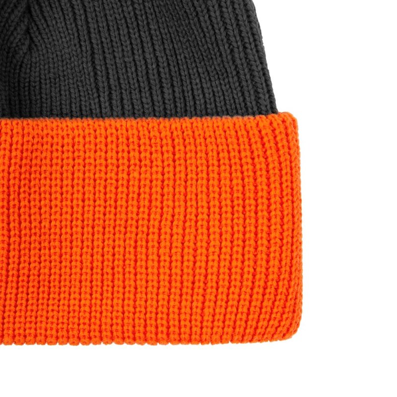 Двуслойная шапка фактурной вязки с контрастным подворотом и помпоном.