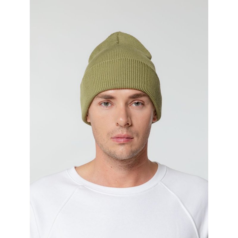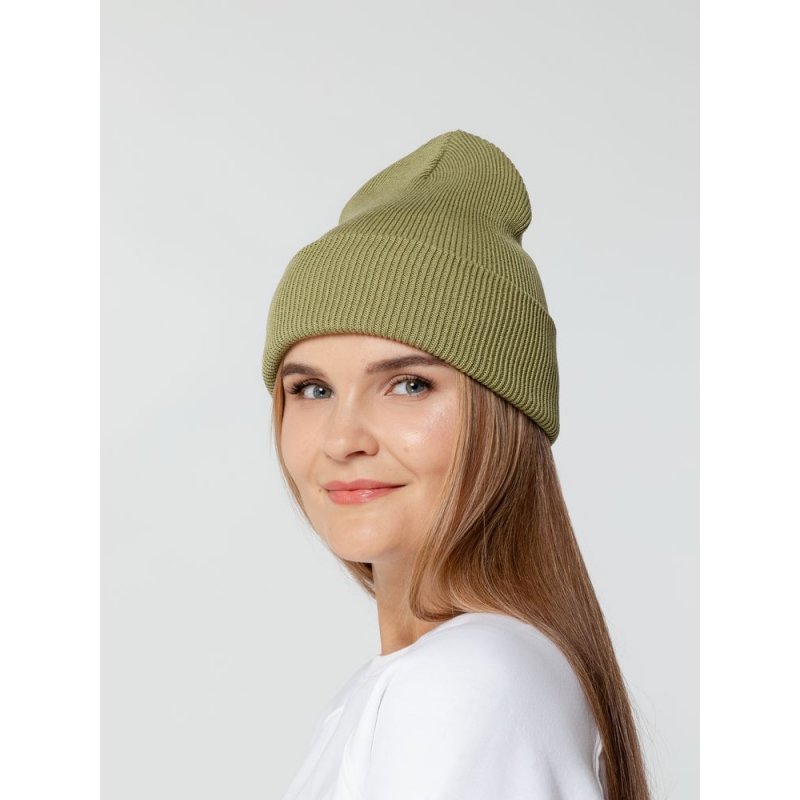 Двухслойная шапка, связанная резинкой, с широким отворотом.