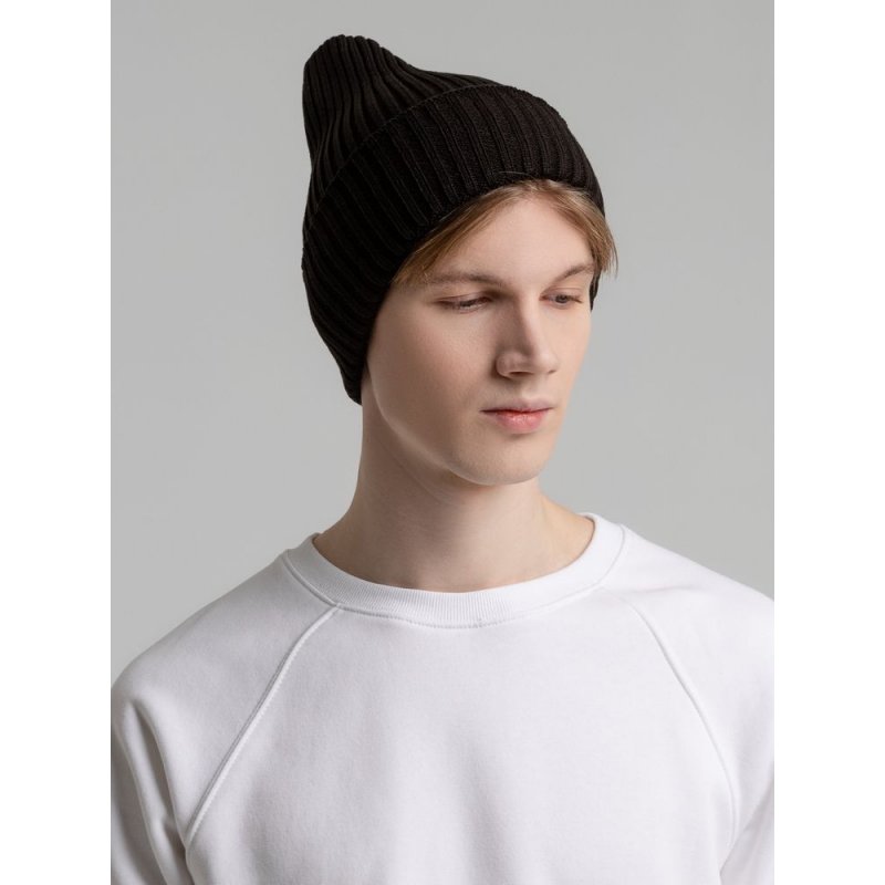 Однослойная шапка фактурной вязки с двойным отворотом.
