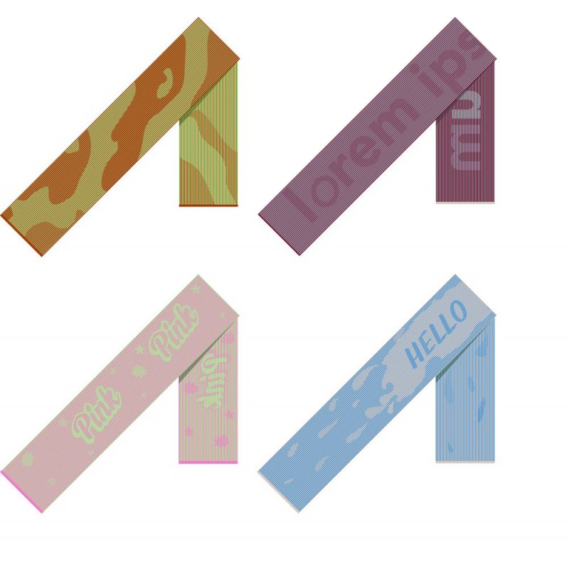 Модель: шарф с жаккардовым узором, рисунчатый эффект получается за счет смены петель. Вязание возможно только в 2 цвета: рисунок читается с обеих сторон шарфа, но на обратной стороне происходит инверсия цвета — текст оказывается в зеркальном отражении. Модель не имеет швов, вяжется единым полотном. Имеет лицевую и изнаночную сторону.