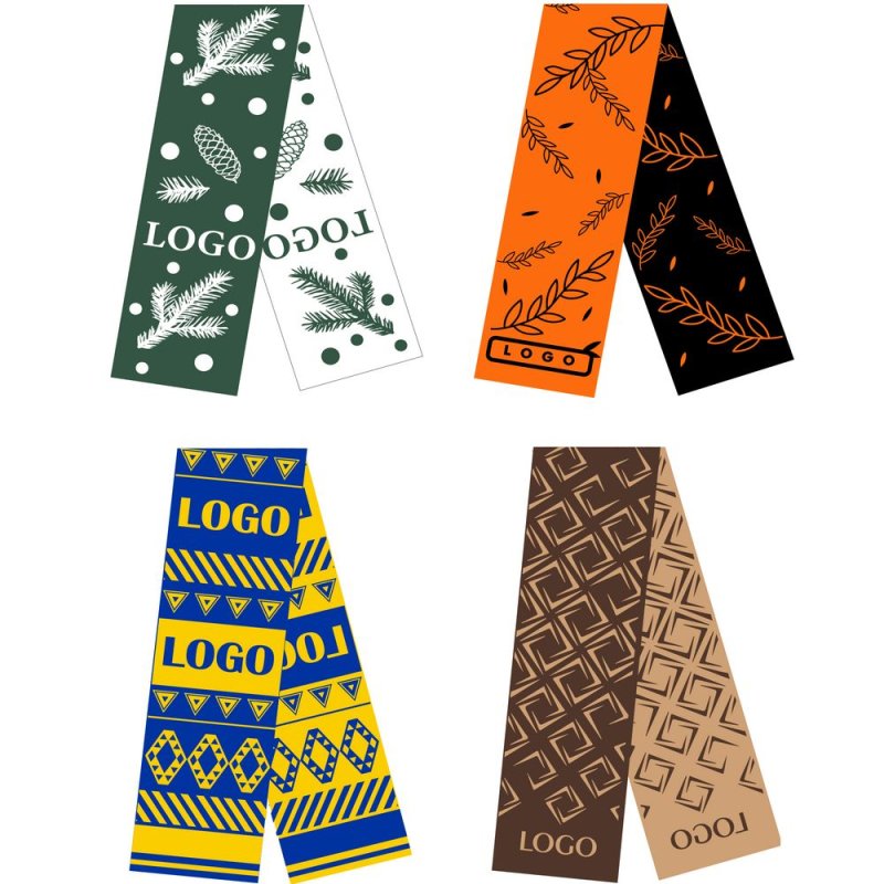 Шарф с вывязанным логотипом и индивидуальным рисунком в фирменной цветовой гамме.