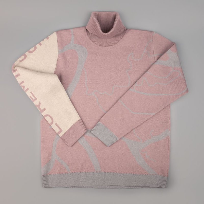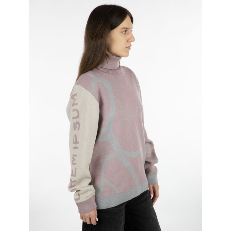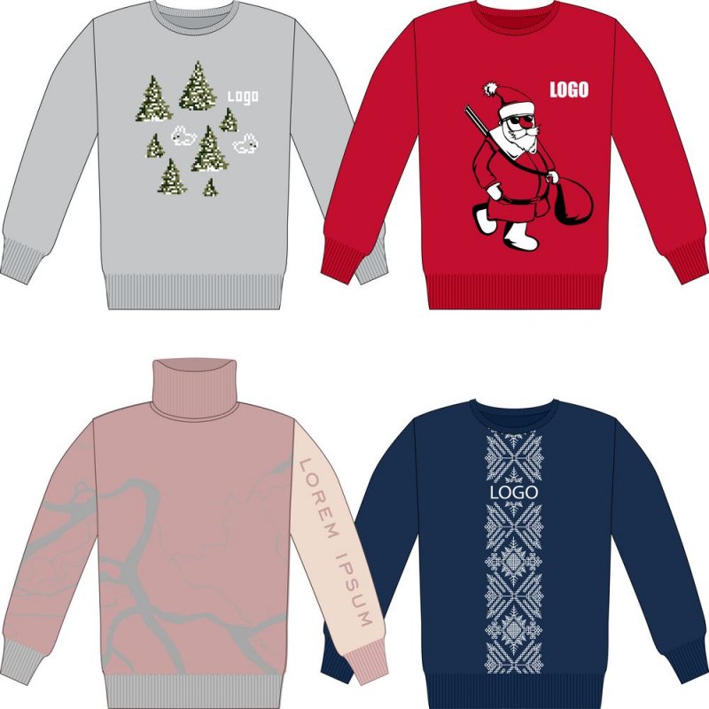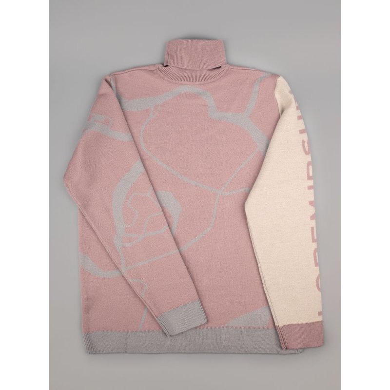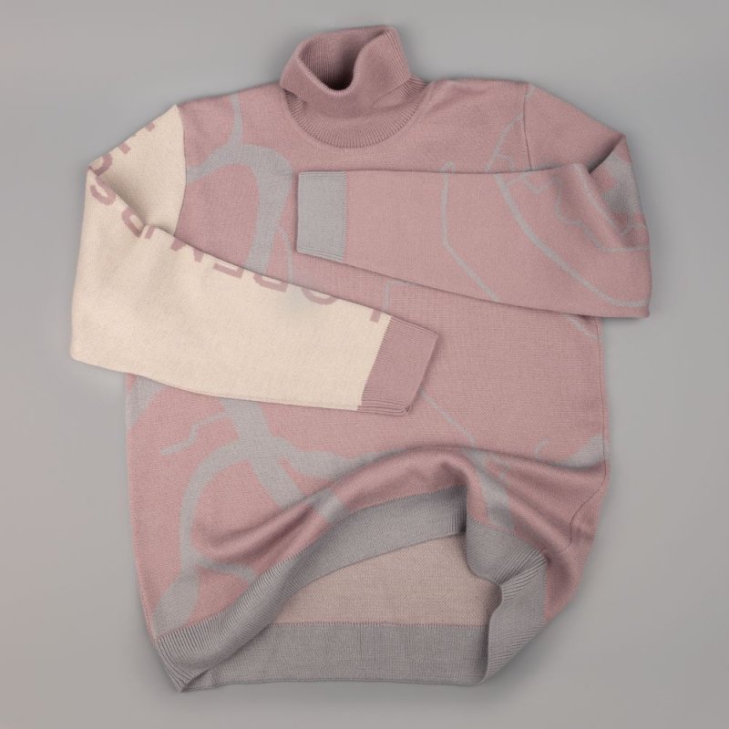 Свитер с вывязанным логотипом и индивидуальным рисунком в фирменной цветовой гамме.