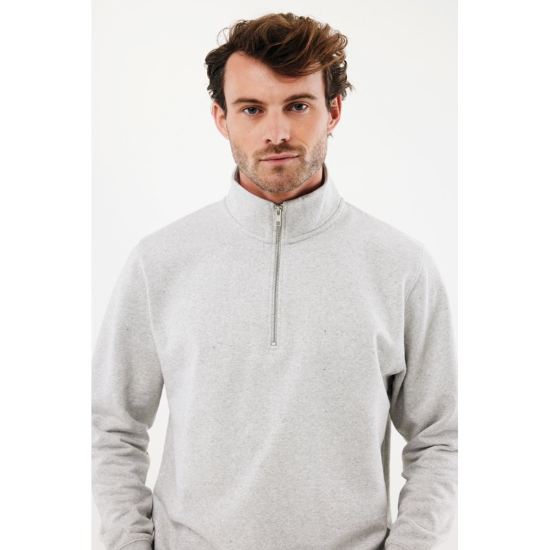 Свитшот на молнии выполнен из 100% хлопка, который на 30% состоит из переработанного и на 70% из органического. Воротник-стойка, втачные длинные рукава и резинка по манжетам и низу. Внутренняя сторона выполнена из френч-терри.