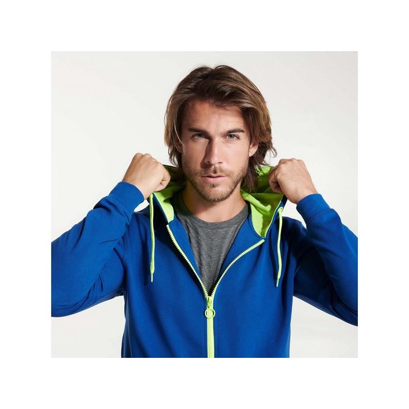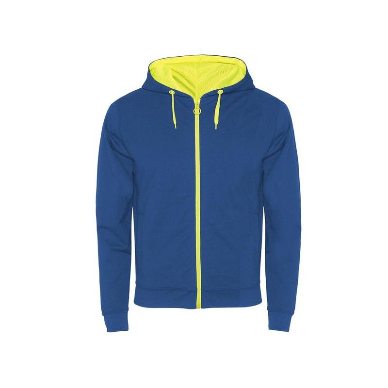 Толстовка на молнии из френч терри без начеса с деталями неонового цвета. Центральная молния с контрастным пуллером. Подкладка капюшона из микроперфорированного полиэстера контрастного неонового цвета.Шнур капюшона и айлетсы контрастного неонового цвета. Риб 1х1 на манжетах и внизу изделия. Два боковых кармана с широкой листочкой. Укрепляющая строчка внутри горловины.