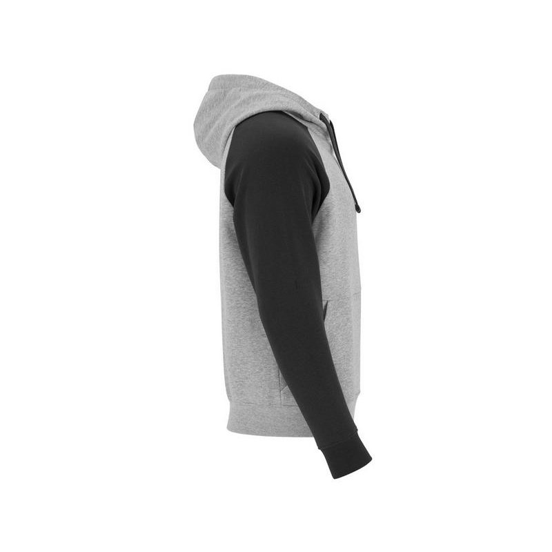 Худи с контрастным рукавом реглан. Капюшон с запахом, с контрастной подкладкой и шнурком. На полочке карман кенгуру. Манжеты рукавов и низ изделия из риба 1х1.