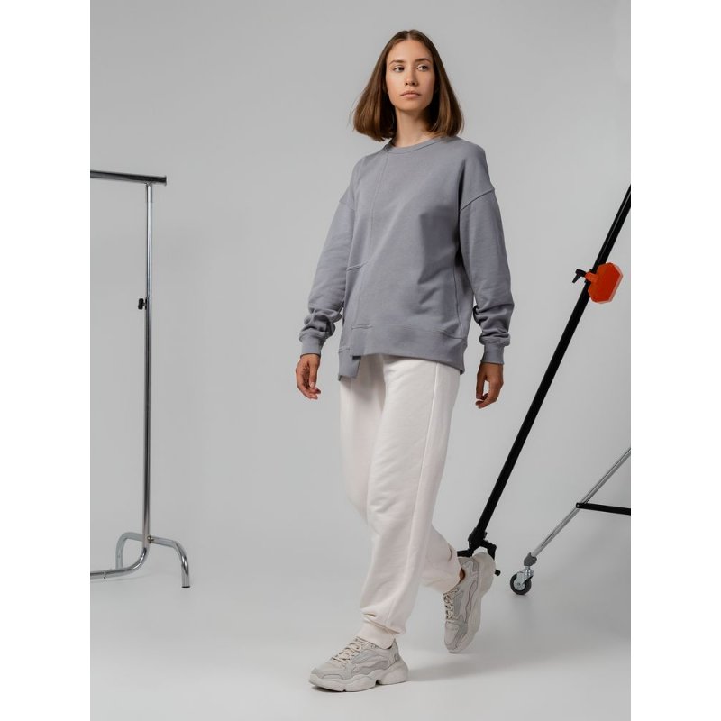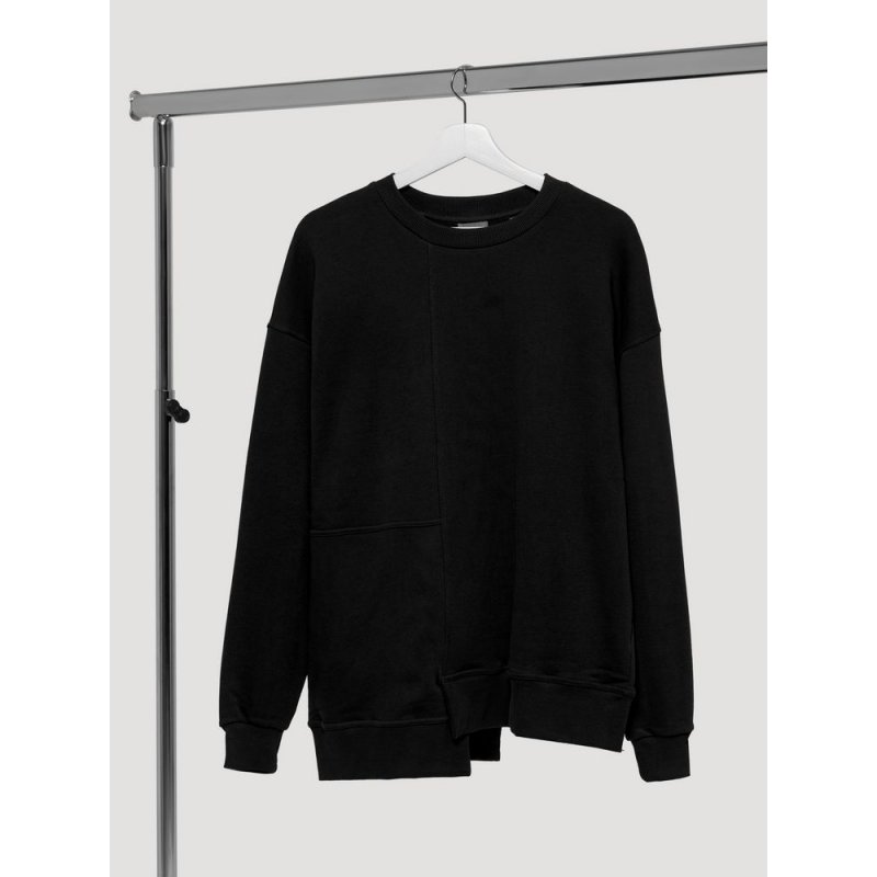Свитшот унисекс свободного кроя со спущенным плечом и нестандартным нижним краем.