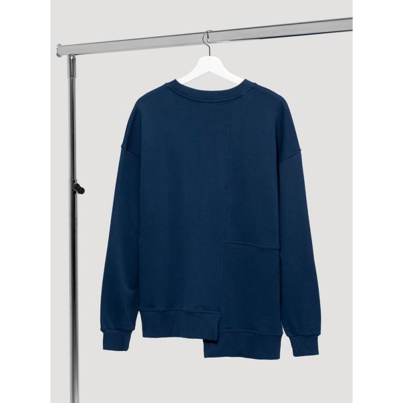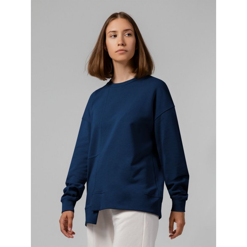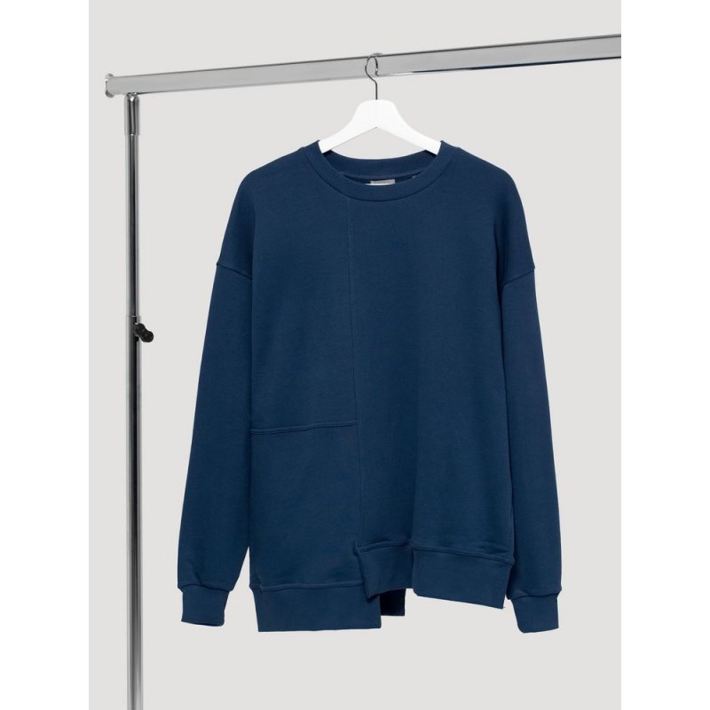 Свитшот унисекс свободного кроя со спущенным плечом и нестандартным нижним краем.