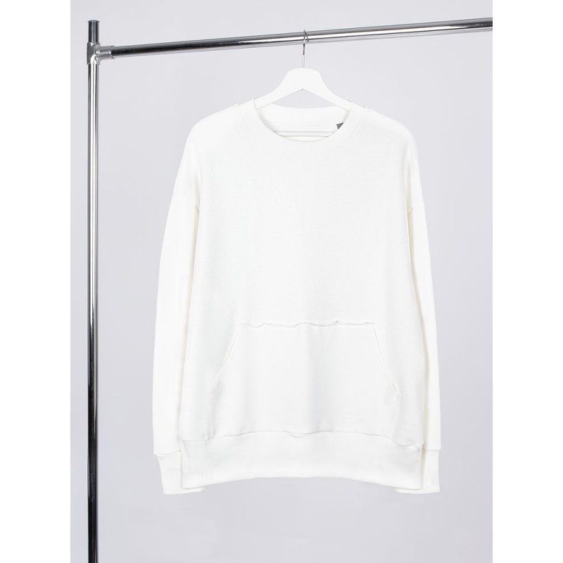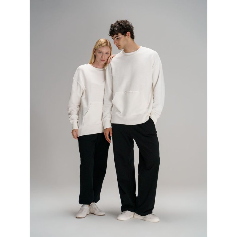 Благодаря особой конструкции, где часть деталей — перед и спинка — вывернута наизнанку, свитшот приобретает запоминающийся вид. Так внутренняя, обычно незаметная сторона материала превращается в лицевую: миниатюрные петельки бывшей изнанки становятся настоящим украшением толстовки, добавляя ей оригинальности и эффект невероятно приятной плюшевости.