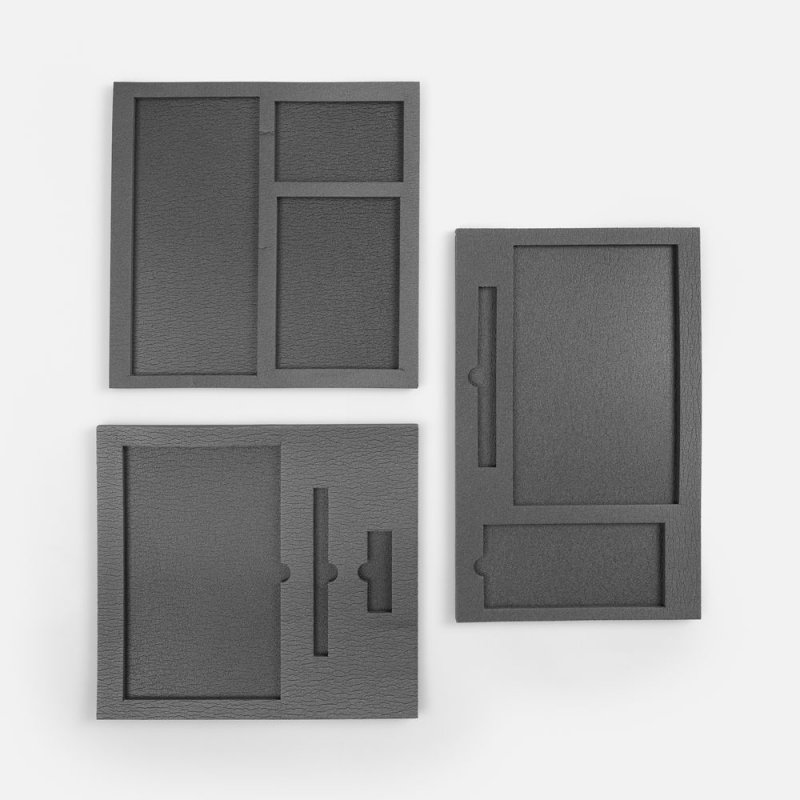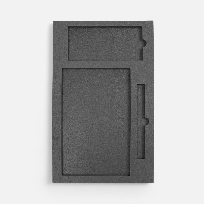 Ложемент, изготовленный из материала Izolon 500 черного цвета, представляет собой многослойную конструкцию, состоящую из нижнего слоя толщиной 5 мм и верхнего слоя толщиной 10 мм. В соответствии с утвержденным макетом, проемы для размещения предметов могут быть спроектированы как в одном, так и в обоих слоях.