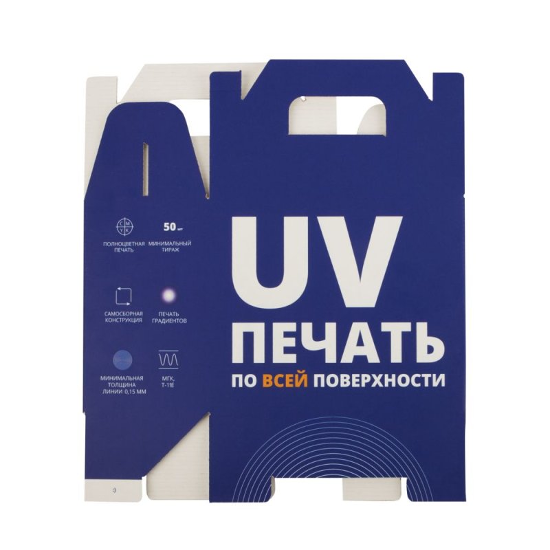 В стоимость входит полноцветная печать с лицевой стороны. Печать производится на UV-плоттере непосредственно на листе картона, минуя стадиюкаширования .