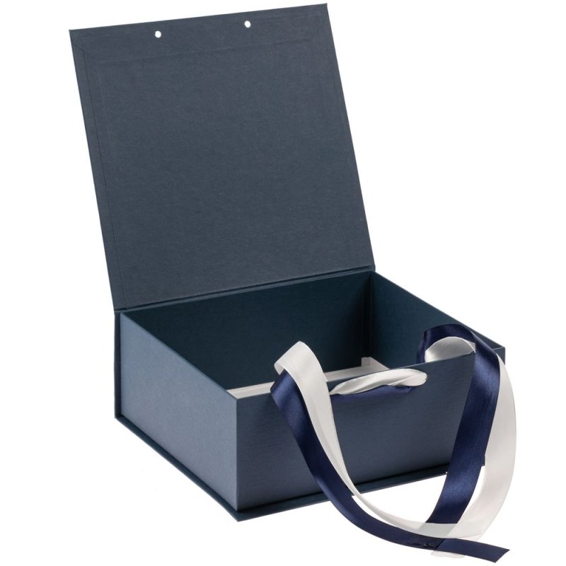 Коробка выполнена из переплетного картона, кашированного дизайнерской бумагой Efalin, с крышкой на лентах.