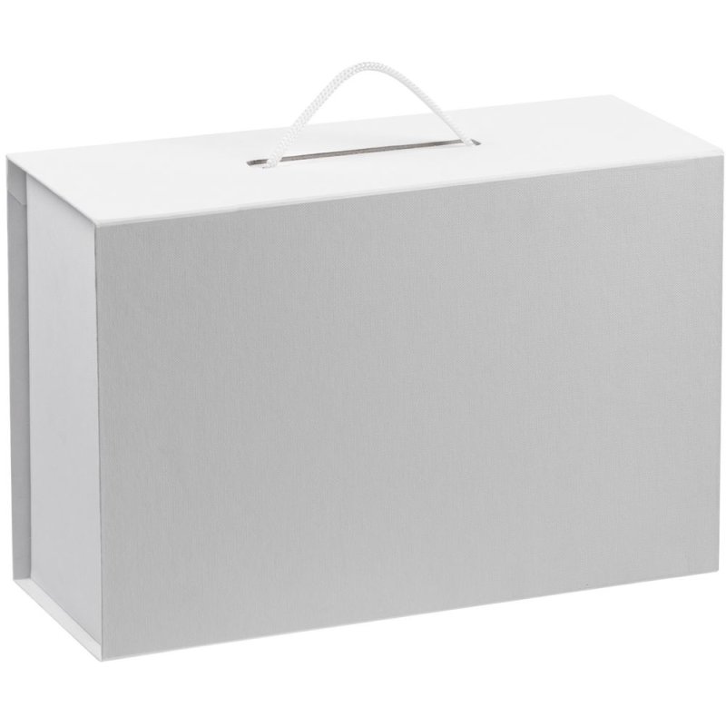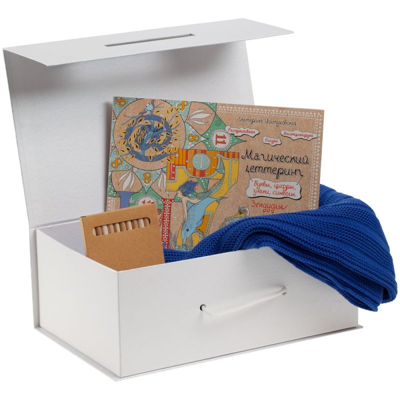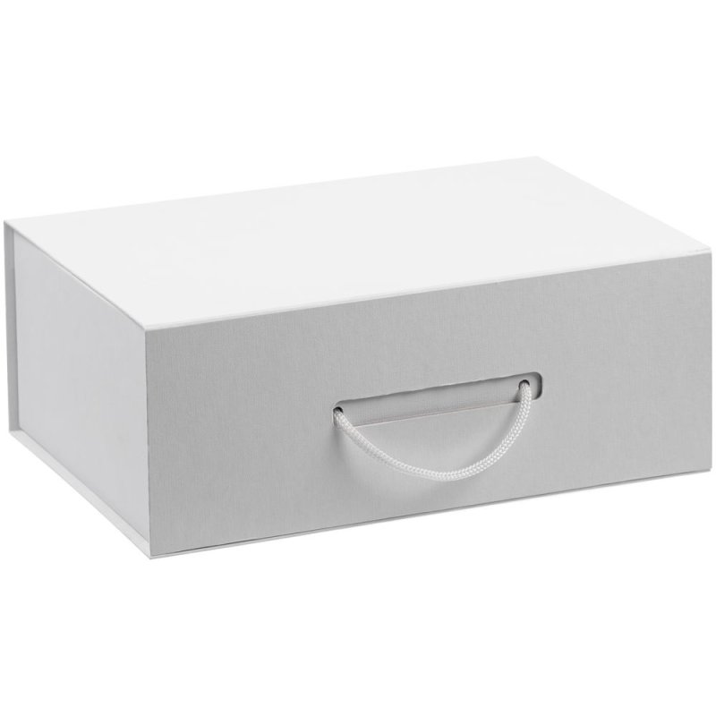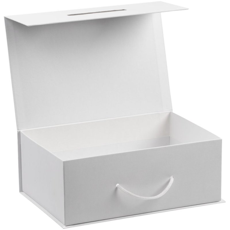 Коробка выполнена из переплетного картона, кашированного дизайнерской бумагой Majestic «белый мрамор», с крышкой на магните. Выдерживает вес до 2,5 кг.